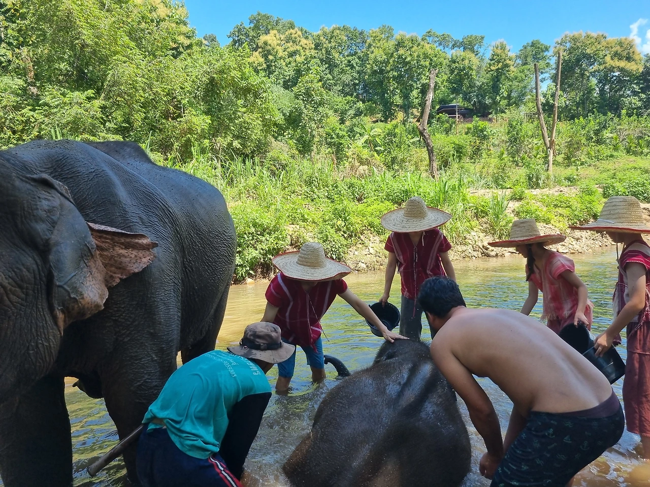 더운 날씨 탓에 산책은 하지 않고 간식 주는 시간을 더 길게 가져갔다.머드 체험은 생략한 채 바로 목욕 체험을 했다. 목욕 체험이 하이라이트다. 흐르는 계곡에 코끼리와 함께 들어가 바가지로 물을 뿌려주는데, 목욕이라기보다 코끼리와 함께 하는 물놀이였다.