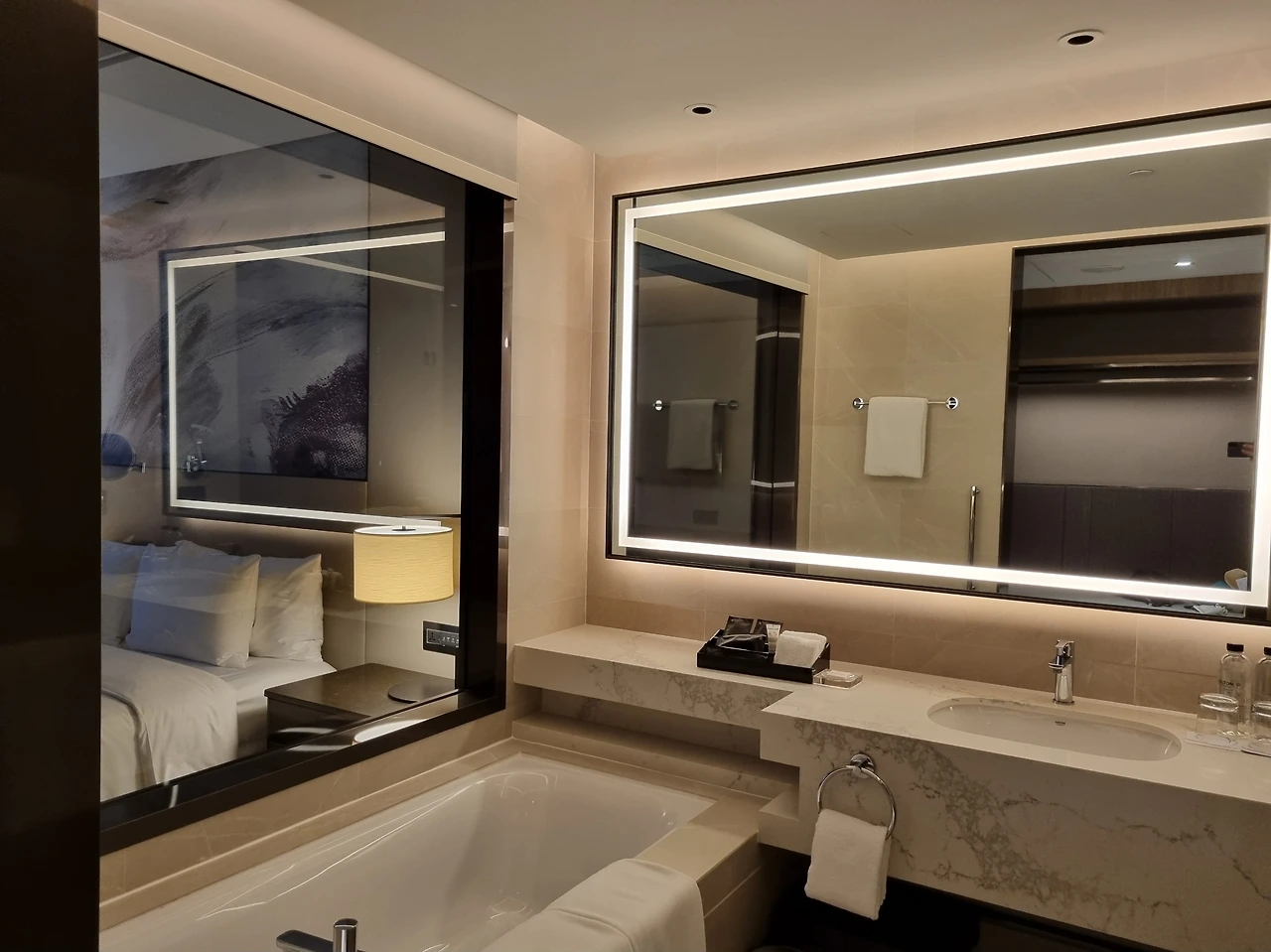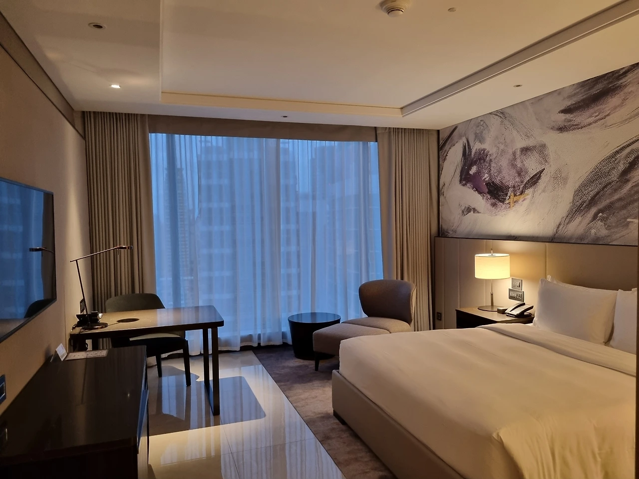 이 호텔의 특징 중 하나는 통유리로 된 창이다. 모든 객실이 시티뷰인데, 통 창에 멍 때리고 서 있으면 여행에서만 느낄 수 있는 몸과 마음이 확 트이는 느낌을 받을 수 있다. 통 창을 가려주는 흰색 커튼과 암막은 모두 자동으로 여닫을 수 있다.