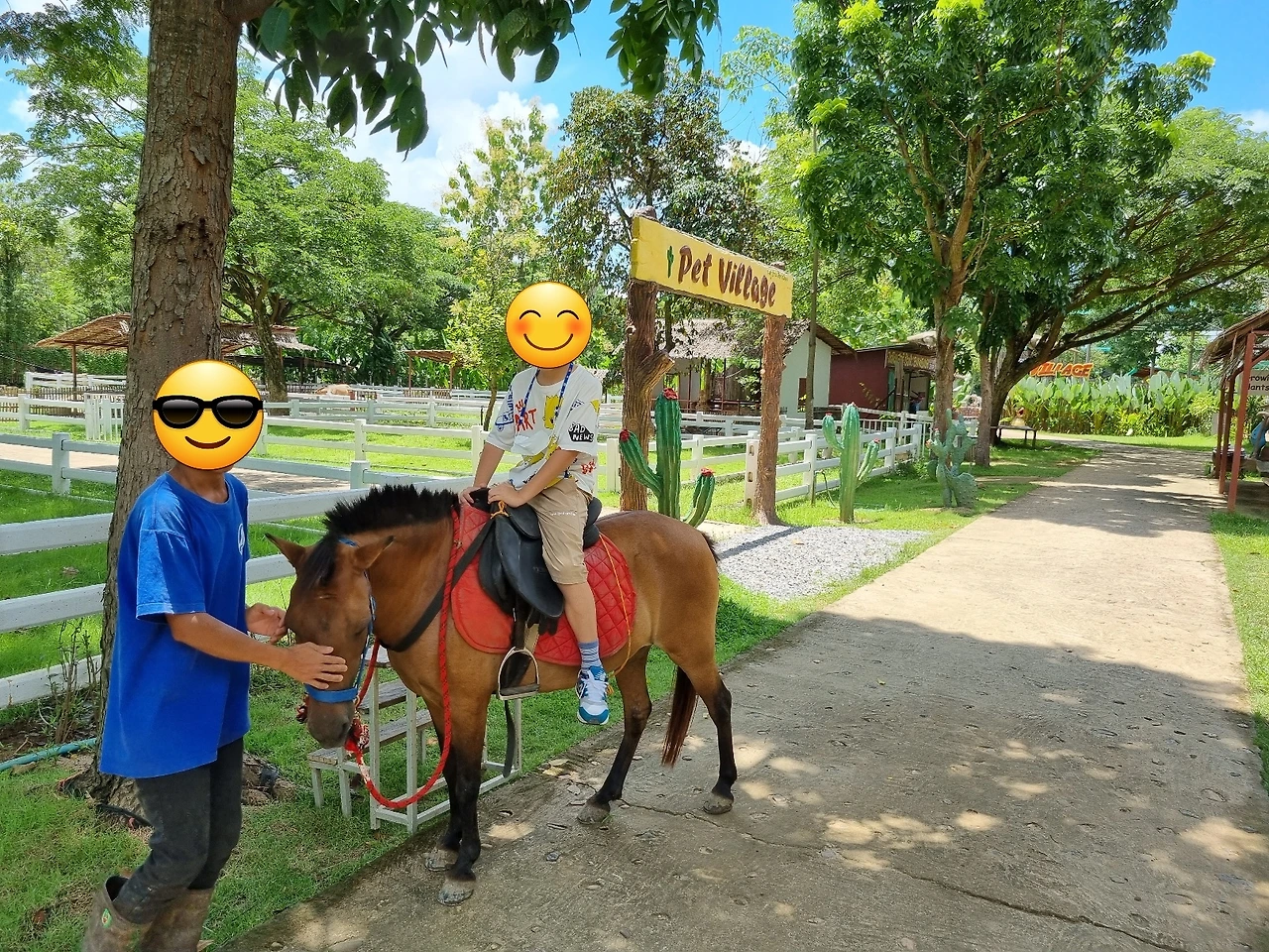 아들은 난생처음으로 말을 탔다. 마부가 말고삐로 끌어주다 중간중간 아이가 혼자 탈 수 있게 고삐를 놓기도 했다. 아들은 나중에 긴장이 풀리면서 신나는 얼굴로 승마를 즐겼다. 가격 대비 훌륭한 체험이었다. 몇 번이고 더 태워주고 싶었지만 아들은 "지금이 딱 좋다"라고 거절했다. 승마는 의외의 경험이었다. 나중에 묵었던 룽나라풀빌라 리조트에서도 승마체험을 했는데 그 말은 우리가 상상한 키 크고 날렵한 모습을 한 말이었다. 지금 생각해보면 히든 빌리지에서 탄 조랑말이 좋은 훈련이 됐던 것 같다.