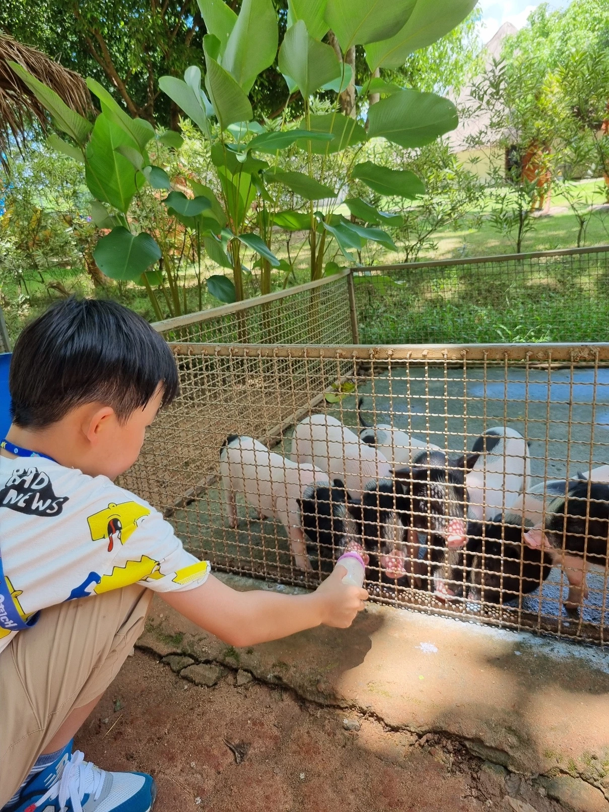 히든 빌리지는 매표소를 지나면 작은 돼지우리가 나온다. 엄빠 돼지와 아기 돼지를 다른 우리에서 키우고 있는데, 우유를 먹이는 Feeding 체험을 할 수 있다. 근처 매점에서 우유가 든 아기 젖병을 사면 된다. 비용은 20밧. 아기 돼지들이 귀엽다. 돼지우리 옆에는 양들을 사육하는 비교적 크고 넓은 우리가 나온다. 여기서도 feeding 체험이 가능하다. 우리는 우유 1개를 사서 아기 돼지와 양에게 먹였는데 가격 대비 괜찮은 경험이었다. 우유 외에 당근 같은 먹이도 판다. 가격은 역시 20밧. 저렴한 가격에 사람들도 없어 여유 있게 체험할 수 있다.