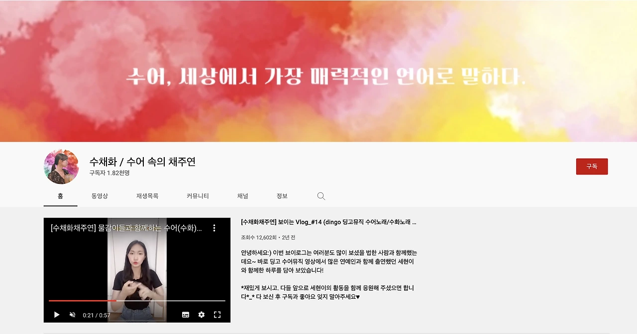 � 채주연님의 수어 영상을 더 보고 싶으시다면 유튜브 채널 수채화 채주연을 검색해주세요.