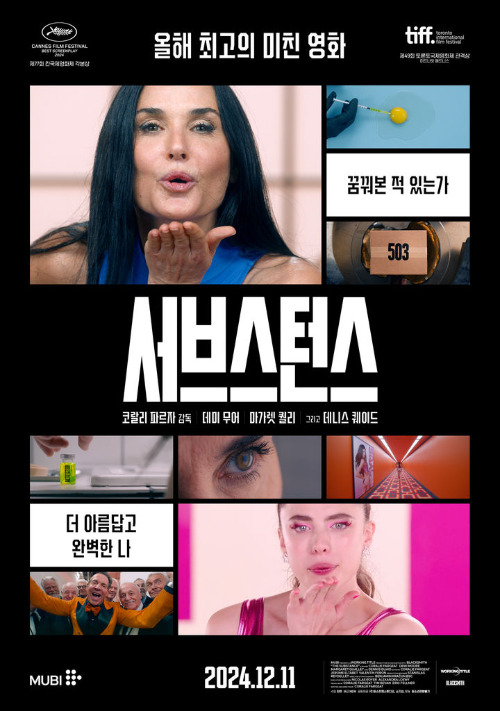 내가 '공모'라는 표현을 들고 온 것은, 이 글의 주제인 영화 <서브스턴스>가 여러 의미에서 과격한 영화이기 때문이다. 고어하고 폭력적이며 불쾌감을 조성할 뿐 아니라, 감독은 자신이 말하고자 하는 바를 말 그대로 '과격하게' 스크린에 투영하고 있다. 그 과격함에 누군가는 '도저히 못 봐줄 영화'라고 생각할 수도 있겠으나, 현재까지 꽤 좋은 평가를 전문가들과 일반관객 양쪽으로부터 받고 있다. 그러니까, 잔인성과 폭력성, 선정성 등은 영화를 평가할 때 큰 문제가 되지 않는다. 중요한 것은 '공모'의 여부이다. '이 모든 장면들에도 불구하고, 나는 이 영화와 공모할 수 있는가?' '이 장면을 이해할 수 있는가?' 서브스턴스를 관람한 대다수의 관객은 "그렇다"고 연호하고 있다.