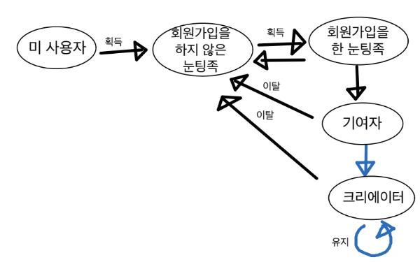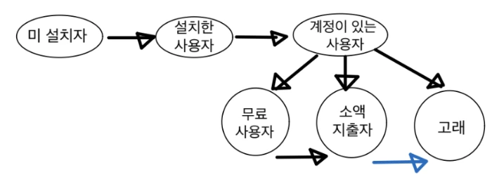 5. 이커머스: 물리적인 세계와 연관이 있다는 점에서 순수 it 회사들과는 조금 결이 다르다. 사용자의 구매액이 매출에 직결되기에 사용자를 늘리거나 장바구니 크기를 늘리는 것이 중요하다. 한 가지 또 생각해보아야 할 점은 장바구니 포기율이 60%에 달한다는 것이다! 매일 방문하더라도 구매로 이어지지 않는다면 유효한 사용자가 아니기에, AARRR에서 '판매' 퍼널까지 넘어가도록 집중해야 한다. 웨딩 산업같이 특정한 분야에서는 신규 유입이 '고래' 보다 중요할 수 있다.