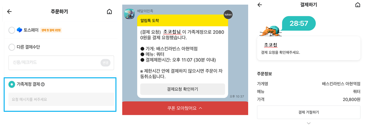 가족 대표에게 결제 요청을 보낼 때 간단하게 메시지를 남길 수 있어 매우 유용하다. 결제를 취소할 경우에도 답 메시지를 보낼 수 있어 배민스럽다는 생각이 들었다. 주문 배달 현황을 가족 대표와 구성원 모두가 확인 가능하도록 하여 더욱 편리하다.