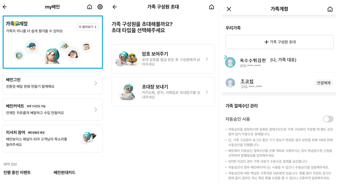my배민 페이지에서 가족 계정을 생성할 수 있다. 계정을 생성한 사람이 가족대표이며, 계정을 함께 사용하는 사람을 가족 구성원이라고 한다. 계정 당 1개의 가족계정에만 가입이 가능하다. ① 가족 구성원이 결제 요청을 한 후 ② 가족 대표가 결제를 승인하면 ③ 가족 대표의 결제수단으로 결제가 완료되며 ④ 매장에 주문 완료가 되는 시스템이다. 가족 대표의 결제 승인은 30분 이내 완료되어야 하는데, 이조차 번거롭게 느껴진다면 자동승인을 설정해 놓을 수 있다. 자동승인 횟수 제한은 월 10회, 30회, 무제한 혹은 직접 입력하여 설정할 수 있다.