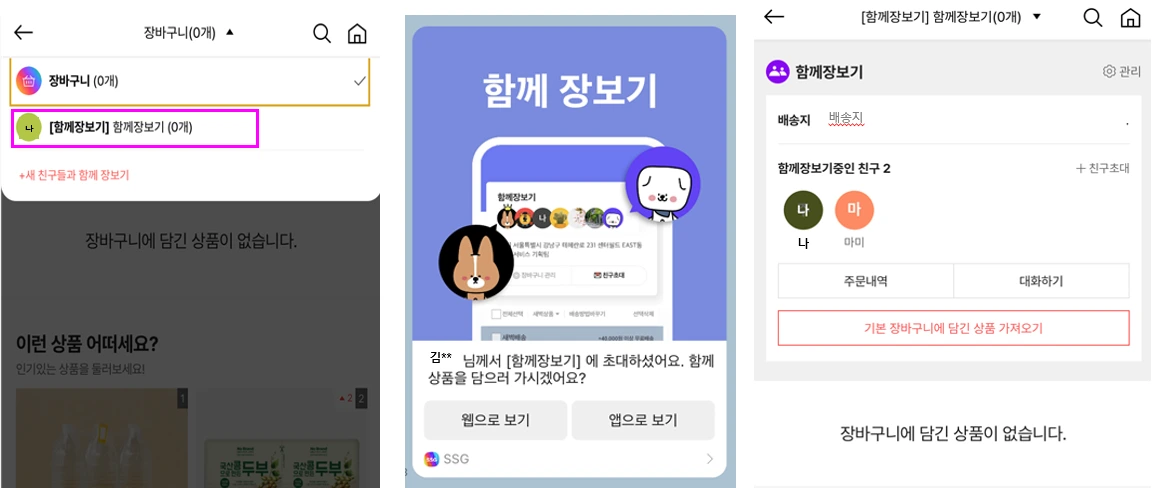 가족이 오프라인에서 장을 볼 때는 엄마가 장바구니를 들고 다니면 가족이 본인이 필요한 것을 장바구니에 담고, 엄마가 한 번에 계산을 한다. SSG은 이러한 구매 경험을 온라인으로 가져왔다. 장바구니 상단에 [함께 장보기]를 선택하여 다른 사람과 함께 장바구니를 공유할 수 있다. 예전에는 탭으로 구성되어 확인하기 좋았는데, 드롭다운으로 변경되며 기능을 모르는 사람은 찾기 어려워졌다.