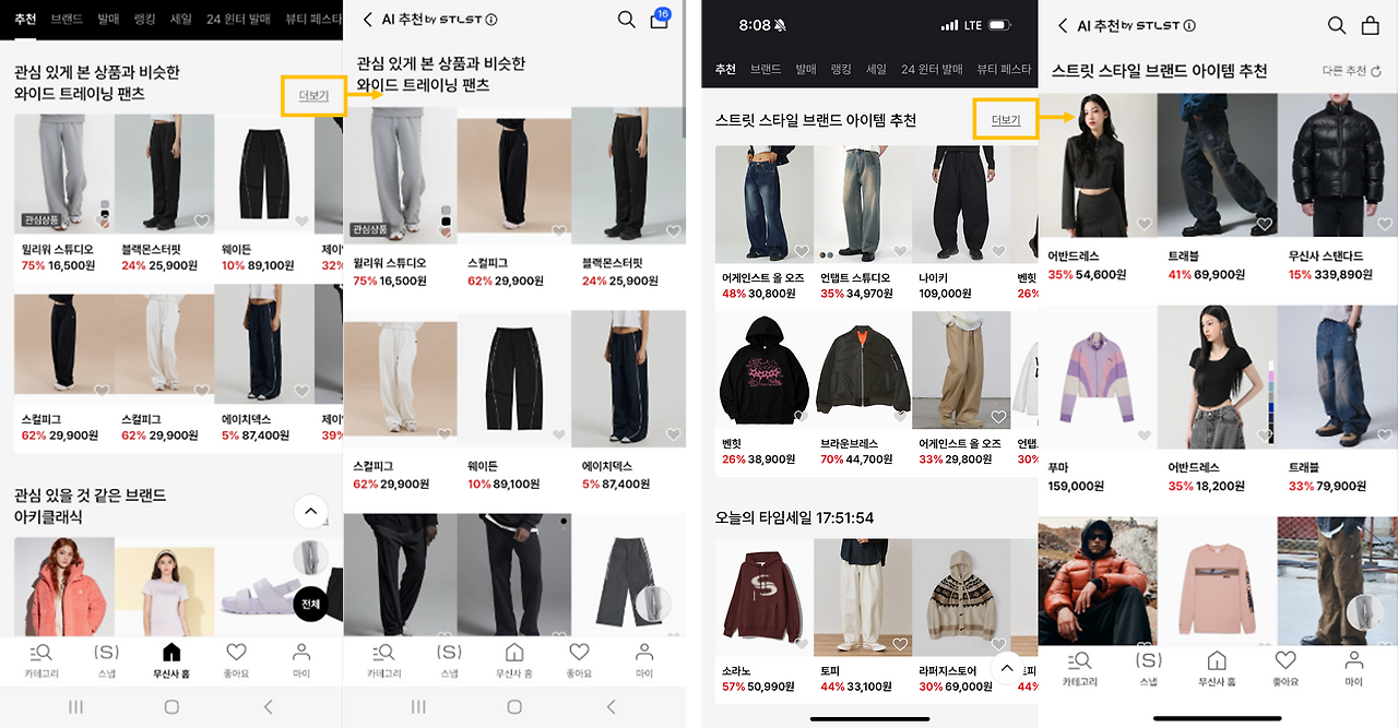 2. '와이드 트레이닝 팬츠'와 같이 구체적인 세부 품목으로 추천을 하기도 하고, '스트릿 스타일 브랜드 아이템'과 같이 스타일 기준으로 추천을 하기도 하고, 브랜드 기준으로도 추천을 한다. 각 코너의 추천 기준이 다르다보니 추천 코너가 많더라도 지루하다는 느낌이 적고, 정말 나를 위한 추천이라는 생각이 든다.