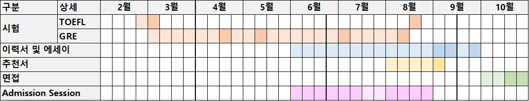 준비해야 할 요소는 어학시험(Toefl), GRE 혹은 GMAT 점수, 이력서(resume), 에세이, 추천서(letter of recommendation), 그리고 면접이 있다. 그 외에도 학교에 대해서 탐색하는 시간이나 에세이 이외의 application을 작성하는 시간도 마련해 두어야 한다.