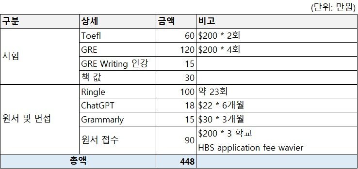 미국 MBA를 지원하며 정말 모든게 다 돈이구나 하는 생각이 들었다. 그래도 이 정도면 MBA 준비하는 사람 중에는 비용을 적게 쓴 편이 아닐까 싶다. 학원을 다니거나, 시험을 더 많이 보거나, 지원하는 학교가 늘어날 수록 비례하여 비용이 커진다고 보면 된다.