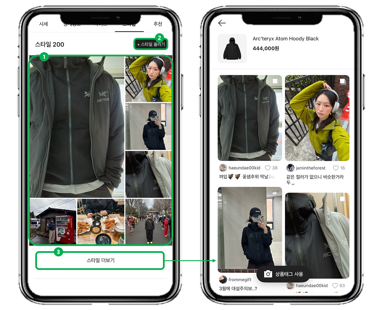 상품에 대한 자세한 설명이나 사이즈 정보를 알 수 있는 것은 스타일이 유일하다. ①스타일 사진을 강조하여 노출하고 ②스타일 올리기 버튼을 통해 등록을 유도하고 ③스타일 더보기 버튼을 통해 추가 탐색 동선을 제공한다.