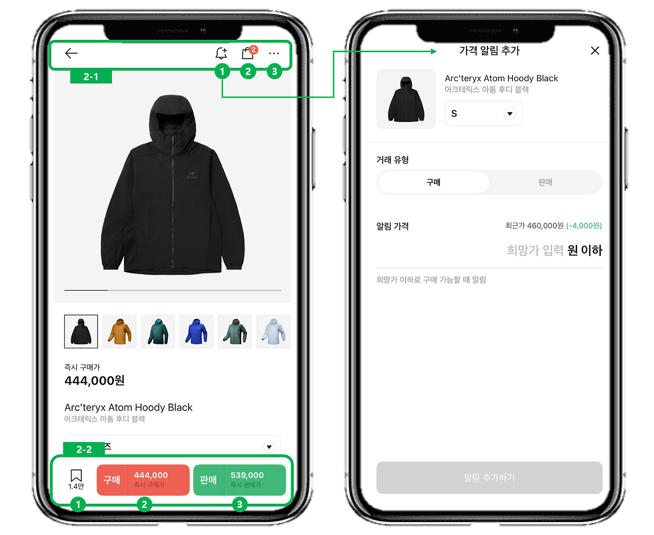 ① 가격 알림 추가: 상품이 희망 구매가 이하 혹은 희망 판매가 이상인 경우 알림을 받을 수 있다. 리셀 상품은 가격 변동이 잦기에 유용해 보인다.