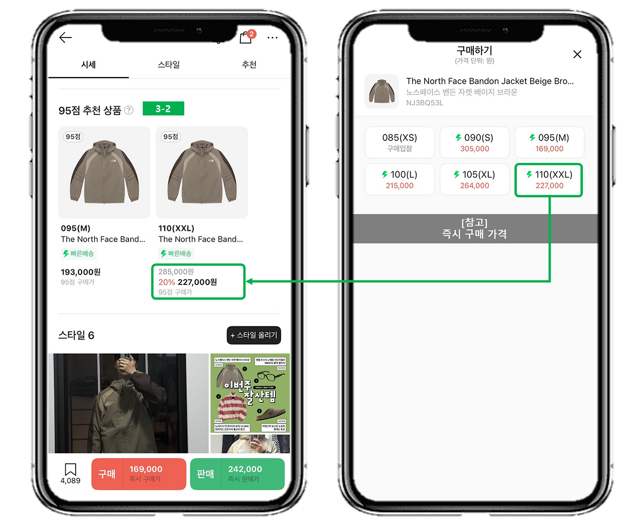 즉시 판매 가격 또한 수시로 변동하며, 사이즈 별로 상이하다. 구매자가 제시한 구매 입찰가 중 최고 가격으로 노출되지 않을까 싶다. 예를 들어 230 사이즈에 구매자 C가 90,000원, 구매자D가 80,000원을 제안한 경우 90,000원으로 표시된다.