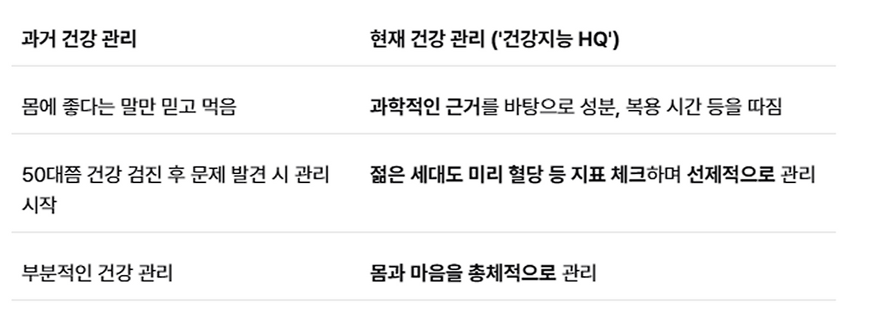 IQ나 EQ가 한때 개인의 역량을 가늠하는 잣대였다면, 이제는 건강지능 HQ가 새로운 기준으로 떠오르고 있다. 식습관과 운동은 물론이고, 혈당·수면·정신 건강까지 데이터로 관리하며 삶을 최적화하는 흐름이 확산된다. 사회 전반의 건강 지식수준이 높아지면서, 혈당·수면·멘탈까지 성분과 지표를 설계하며 삶을 최적화하고 있다. 모든 비즈니스가 결국 건강과 연결될 수밖에 없는 이유다.