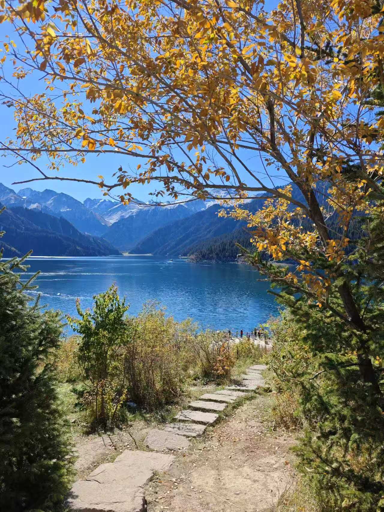 어제 시내에서 톈샨 산맥의 일부를 미리 보기 했다면 오늘은 그중에서도 산과 호수가 만나는 풍광이 있는 천산천지에 오른다. 고도가 높은 지역이라 만년설은 물론 군데군데 녹지 않은 눈도 있었다. 그러니까 어쩌면 나는 2024년도의 첫눈을 여기서 재회한 셈일지도 모른다. 아직 떠나지 않은 붉고 노란 단풍과 오래 전부터 머물렀을 하얀 눈, 그리고 파랗게 흘러가는 호수를 눈이 시리도록 양껏 담았다.