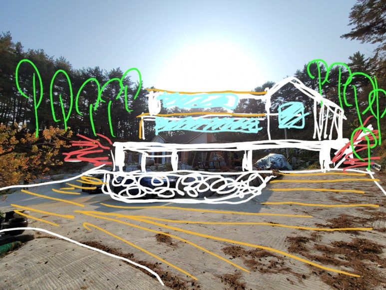 땅의 형태를 본다는건 경사나 높낮이를 체크하는 것인데 눈대중이나 간단한 치수 확인 정도로 설계가 가능한지 별도의 측량이 필요한지 가늠한다. 지형이 익숙해지면 땅위를 이리 저리 걸으면서 곧바로 상상속에서 집을 이렇게 저렇게 앉혀본다. 여기서 상상속 집이 의외로 구체적으로 그려지기 시작하면 집의 외형과 내부 공간까지 대략 틀을 잡아보면서 이미 집의 내외부를 돌아다니기도 한다.