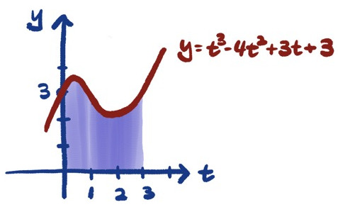 "평균 (1)"에서 다루었던 평균이 몇개의 자료값이 주어진 상황에서 생각할 정의라면 이번에는 함수값에서의 평균을 생각해 보겠습니다. 특히 함수가 y=f(x)에서 x에 들어갈 수 있는 값이 무한개일 때 그것으로 나오는 무한개의 함숫값 f(x) (또는 y로도 볼 수 있는)들의 평균을 말이지요. 사실 "평균 (1)" 글에서 우리가 일정 시간 동안 움직인 자동차의 평균속도를 생각할 때 각 시간들 마다 등장하는 속도값들이 무한개로 나왔었습니다. 그 때문에 총 이동거리와 총 시간을 계산한 후 그 시간안에 그 거리만큼 가기 위한 일정한 속도를 구하여 평균속도를 계산하였지요. 사실 정확하게는 각 시간마다 나타나는 속도가 함수식(특히, 그래프)으로 표현될 수 있다면 역시 평평하고 균등한 개념을 바탕으로 평균속도를 이야기 할 수 있답니다. 만약 자동차의 속도(y km/h)가 시간 t(0분~3분간)에 따라서 y= t^3-4t^2+3t+3로 표현된다고 봅시다. 이것을 각 t시간마다 함숫값 y를 계산하여 무수히 많은 점들이 찍혀 그리는 멋진 그림인 "그래프"로 나타내면 다음과 같습니다.