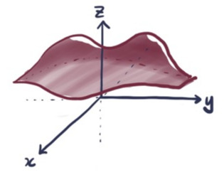 그럼 y=f(t) (또는 y=f(x))에 대한 평균이 다음과 같다면 수학자들은 다음 단계로 z=f(x,y)와 같이 변수가 2개 이상이 작용하는 이변수 함수의 평균값을 생각하였을 것입니다. 이변수 함수란 두 개 이상의 변수 x, y에 의해 함숫값이 결정되는 함수입니다. 앞에서의 속도가 시간의 흐름에 따라 변화하는 함수라면 이변수 함수는 두 개의 원인(예를 들면 시간/ 금액/ 인원/ 원료 등등)에 의해 도출되는 결과를 표현하는 함수로 볼 수 있습니다. 수식으로 보면 f(x, y)=x^2 + 4xy -5y 같이 말이지요. 그럼 이런 함수의 그래프를 상상해 봅시다! x축과 y축이 그려진 평면은 이제 함수의 정의역이 됩니다. 함숫값을 표현하는 제 3의 축인 z축을 xy평면의 원점에서 수직으로 곧게 그려준 후, 각각의 (x, y)마다 주어진 이변수 함수 f(x, y)에 의해서 계산된 함숫값 만큼 높이z를 주어 3차원 공간속의 점 (x, y, f(x, y))을 찍어 주는 것이지요. 그럼 xy평면의 각 점마다 높이를 준 점들이 3차원 공간속에 찍히고 이 점들의 모임은 3차원 공간속의 곡면과 같은 형태로 그려집니다.