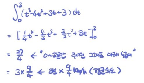 즉, 3분간의 평균 속도는 9/4인 2.25km/h가 되겠습니다! 이것을 어떻게 구하나구요? 바로 적분(!)을 이용하게 됩니다. 위과 같이 구불구불한 속도함수의 곡선 아래 넓이를 구하기 위해서는 적분을 이용할 수 밖에 없겠습니다. 적분에 대해서는 다음 기회에 한번 설명을 해보도록 하겠습니다 ;) 우선 적분법을 알고 있다면 다음과 같이 푸른색 면의 넓이를 구하기 위한 적분 계산이 가능할 것입니다.