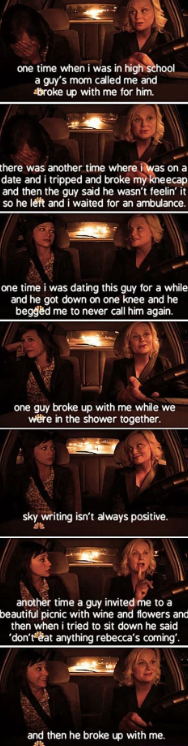 Leslie: One time when I was in high school a guy’s mom called me and broke up with me for him. There was another time when I was on a date and I tripped and broke my kneecap, and then the guy said he wasn’t feeling it, so he left and I waited for an ambulance. One time I was dating this guy for awhile, and then he got down on one knee and he begged me to never call him again. One guy broke up with me while we were in the shower together. Skywriting isn’t always positive. Another time a guy invited me to a beautiful picnic with wine and flowers. And then when I tried to sit down, he said, “Don’t eat anything. Rebecca’s coming.” And then he broke up with me.