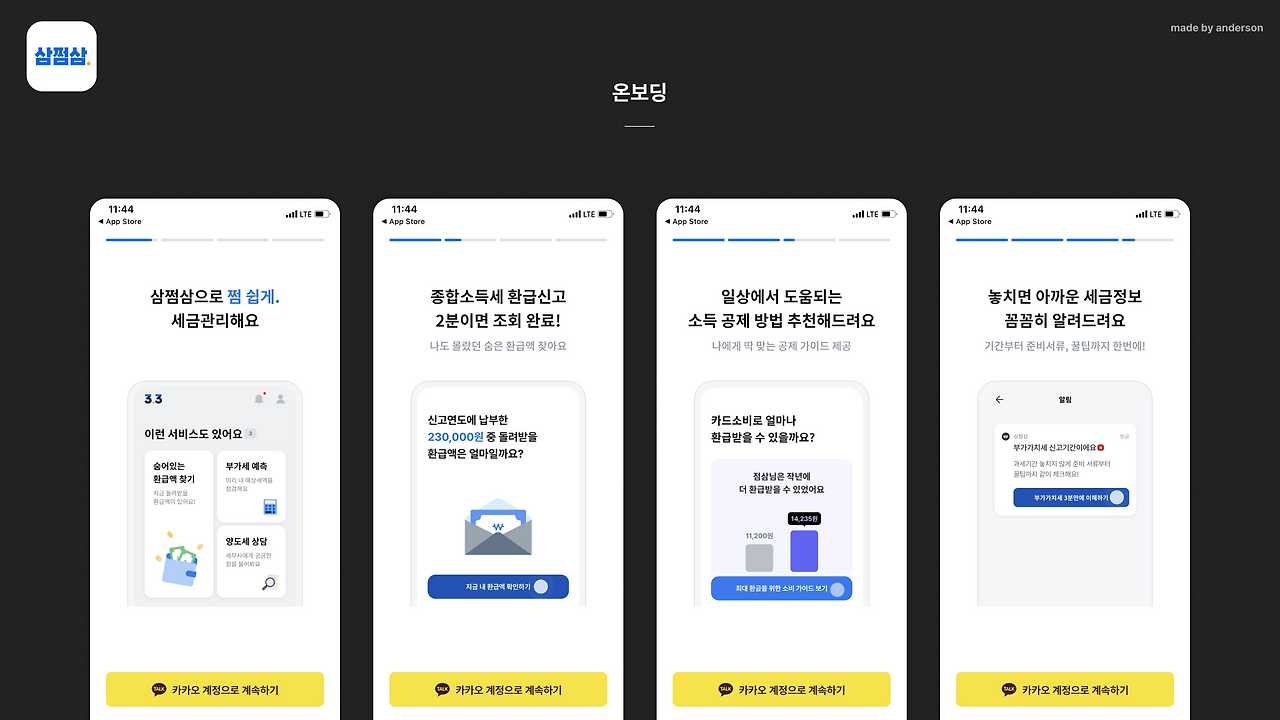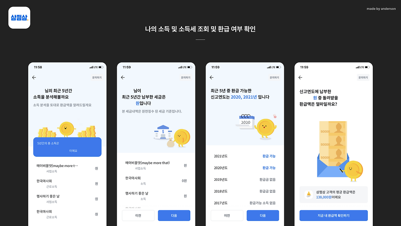 재미있는 인터랙션과 화면으로 나의 소득과 소득세들을 정리해서 보여주고, 환급 여부까지 알려준다.