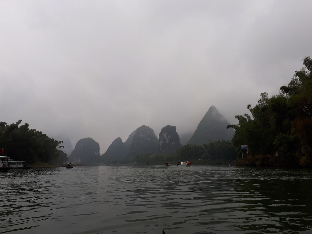 강변에서 작은 모래톱을 지나 겨우 받쳐놓은 철판 한 장이 출렁대며 위태롭게 우리를 배로 인도했기에 순간 분잡한 소음이 불만과 함께 쏟아져 나왔다. 하지만 무협지에서 한 장면만 금방 뽑아낸 듯 치솟아 있는 산들과 마치 풍경화 속에 들어온 것 같은 고요함은 우리네 인생의 굴곡을 눈앞에 펼친 듯 모두 숙연해지고 말았다.