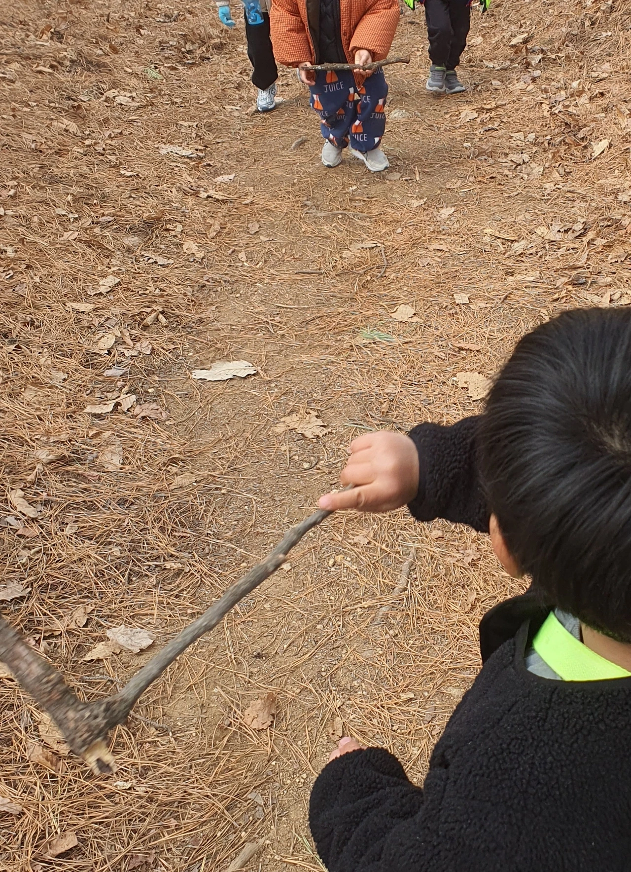 처음에는 혼자 하는 나뭇가지 놀이는 놀이를 하는 시간이 길어질수록 막대기를 많이 잡아 본 선배를 따라가게 되는 게 수순이다. 오늘의 막대기 탐험대에 숲에서 많이 못 놀아본 친구들이 끼게 되면 더욱더 그렇다. 멋지고 단단한 나뭇가지를 고르는 것부터 적당한 길이로 부러뜨리는 법까지 의기양양한 선배의 무용담은 화려하기 그지없다. 옆에서 나의 역할은 추임새를 넣고 추억의 소환에 맞장구를 쳐주는 일이다. 최고의 막대기를 찾아 쥐어 본 경험을 한 아이의 역사는 격앙된 목소리만큼 힘이 있고 빛이 나기도 한다.