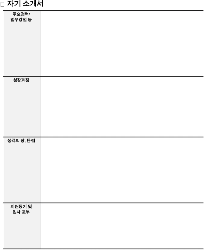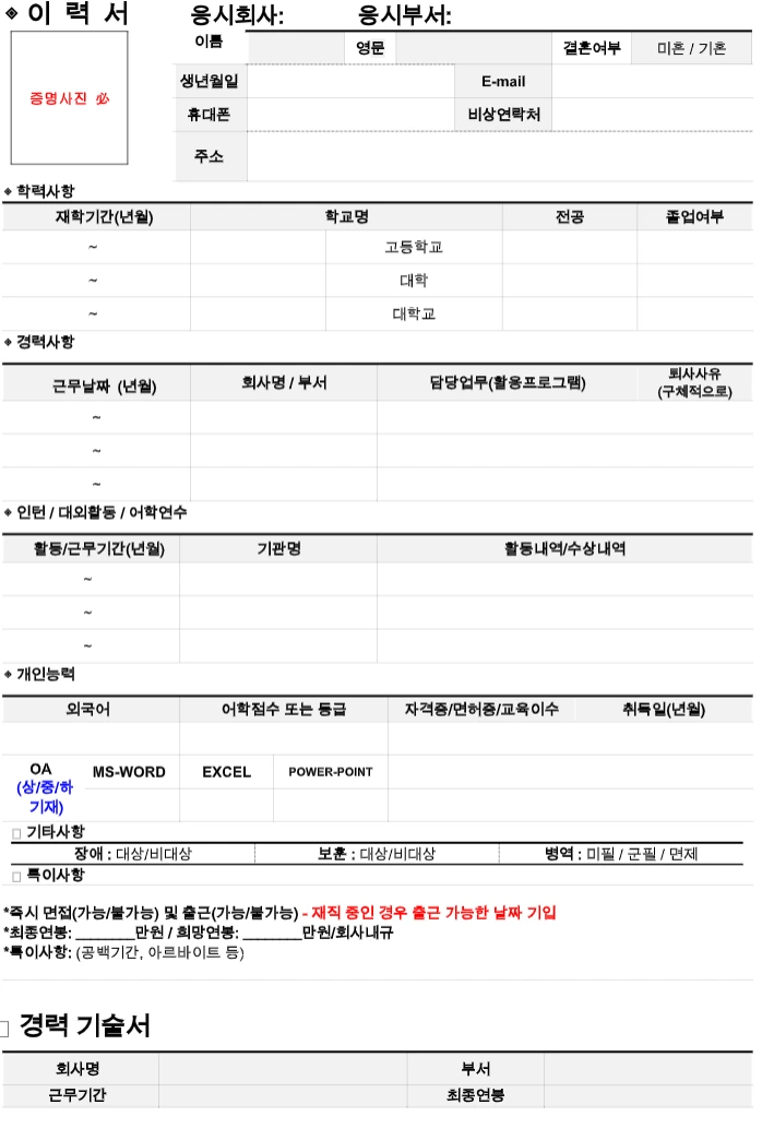 저는 이 탬플릿이 채용대행사가 원하는 양식인지, 지원할 회사에서 원하는 양식인지에 따라 지원할 것 같습니다. 업무와 관계없는 사진이 필수인 점과 성장과정 등의 개인정보 요구는 좀 과한 것 같아서요. 이 정도로 구시대적 마인드 가진 회사에서는 일하기 힘들겠습니다.