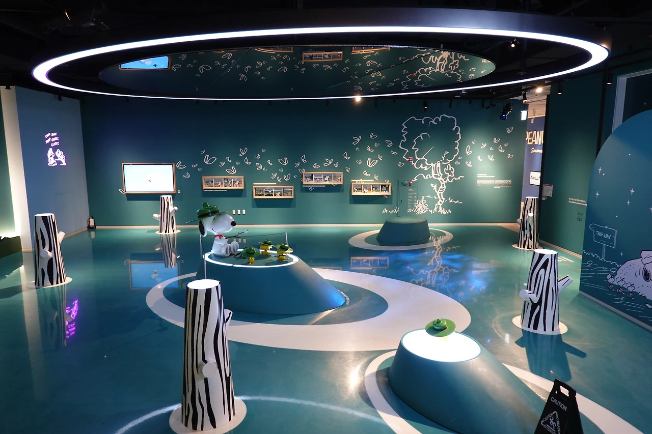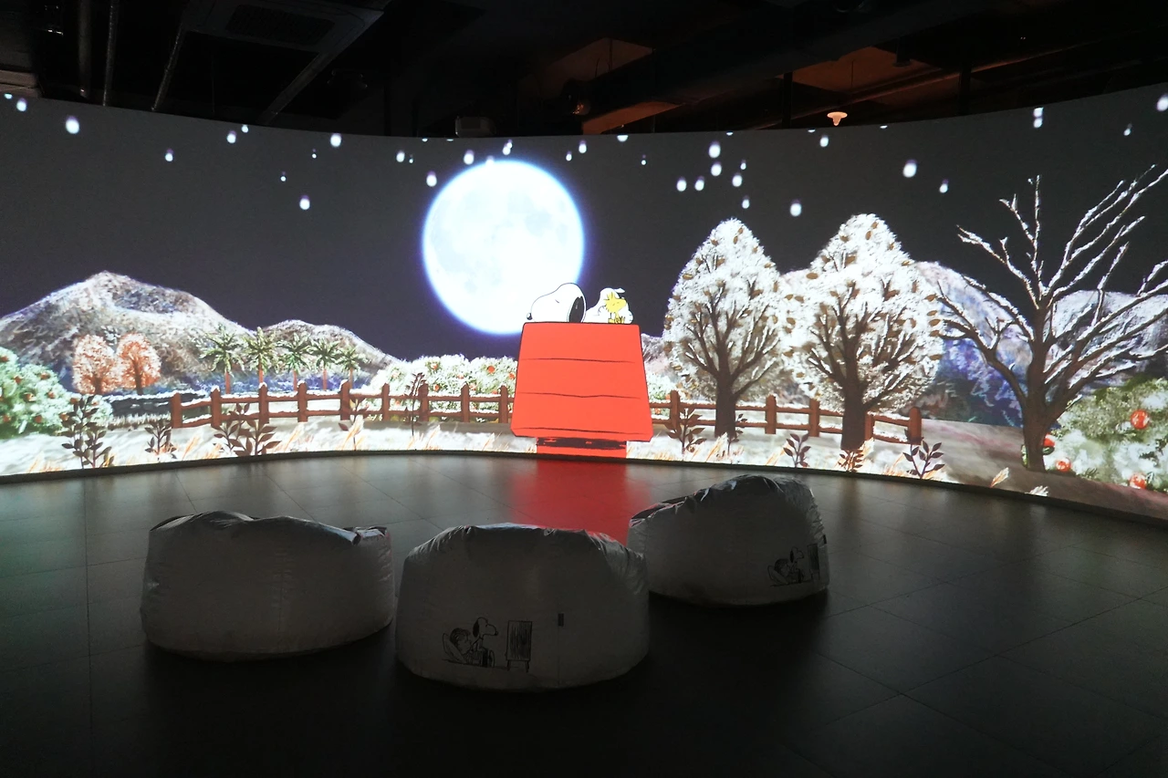 다음은 5개의 테마홀 중 마지막 상상이라는 제5테마홀이에요. 비밀의 방에서도 애니메이션 영상이 상영되고 있었는데 짧은 시간에 스누피와 함께 사계절을 보낼 수 있는 공간이에요. 빠르게 지니가는 사계절이 스누피의 다양한 페르소나를 보는 것 같은 느낌도 받았답니다.