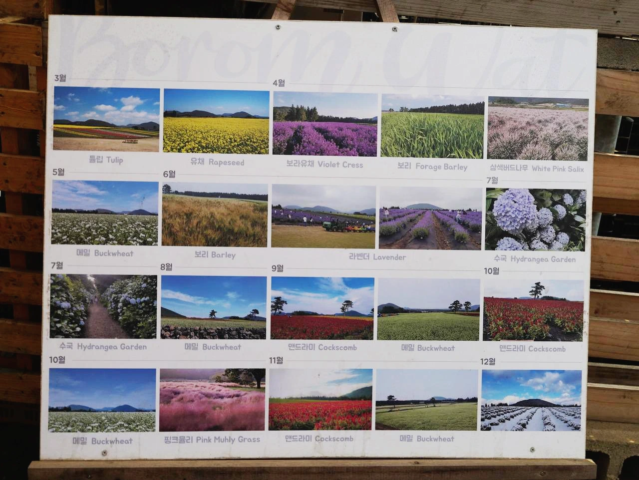 계절마다 피어나는 꽃들이 알록달록한 색감으로 물들여지는 보롬왓! 주변 오름들과 어우러지는 풍광은 이국적인 모습도 느낄 수 있습니다. 5월 제주여행으로 손꼽히는 장소로 3월에는 유채꽃, 튤립을 시작으로 4월 보라유채, 보리, 삼색버드나무, 5월 메밀, 6월 보리, 라벤더, 7월 수국, 8월 메밀, 9월~11월에는 맨드라미, 메밀, 핑크뮬리 등 아름다운 포토존에서 추억을 만들어보세요.