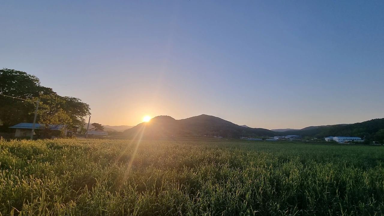 산 뒤로 몸을 숨기려는 해님, 싱그런 바람에 넘실거리는 초록빛 밀 군단. 너무 이뻐서 한눈을 팔았다. 경치멍을 하느라 넋을 잃었다.