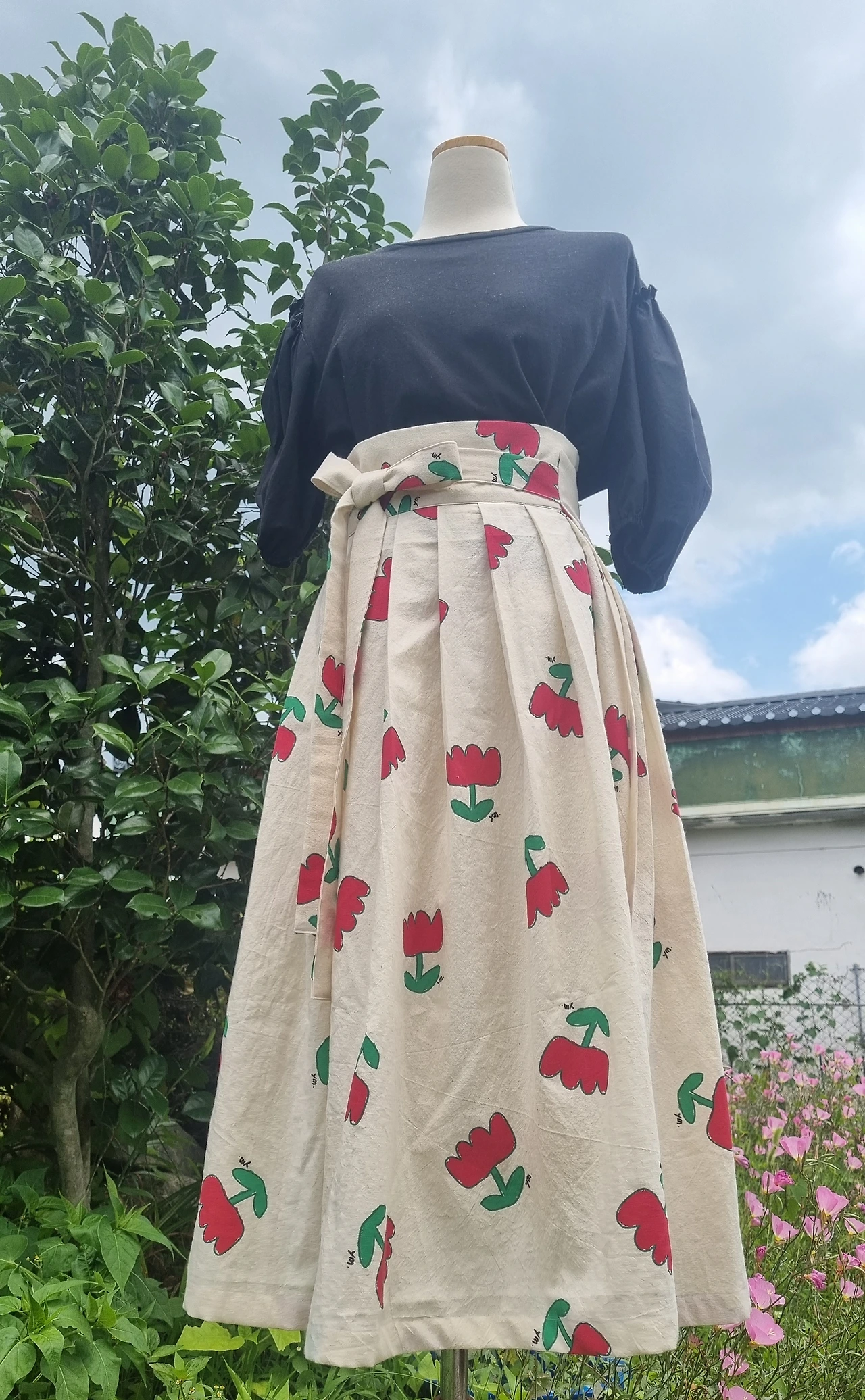 아끼던 원단을 꺼내 들었다. 30수(숫자가 클수록 얇고 부드럽다. 10 수부터 60수까지 다양하다.) 바이오 워싱코튼원단이라 그런지 보드라운 감촉이 기분을 좋게 해 줬다. 포인트로 들어가 있는 빨간 튤립은 시선을 빼앗기에 충분했다.