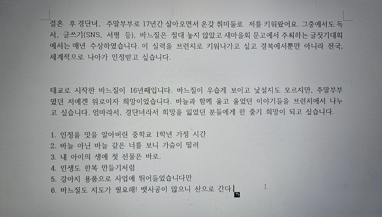 작가소개 이 부분은 가장 일반적인 내용들이었다. 16년째 바느질을 하고 있고, 공장과 병원을 지나왔던 구구절절한 이야기들 뿐이었다. 2번 떨어지고 나서 생각을 아주 바꿔버렸다. '브런치는 어떤 사람을 원할까?' 생각의 전환이 필요했다. 글에 진심인 사람인 걸 강조하고 싶었다. 나름 글쓰기 공모전을 지원해서 매년 상을 꾸준히 받아왔던 터라 그것부터 내세웠다. 바느질이 내 무기라고 생각했는데 일단 뒤로 미루어두고 독서와 글쓰기를 좋아하는 사람이란 걸 강조했다. 글과 가깝다는 인식을 심어주는 것도 도움이 된듯하다.