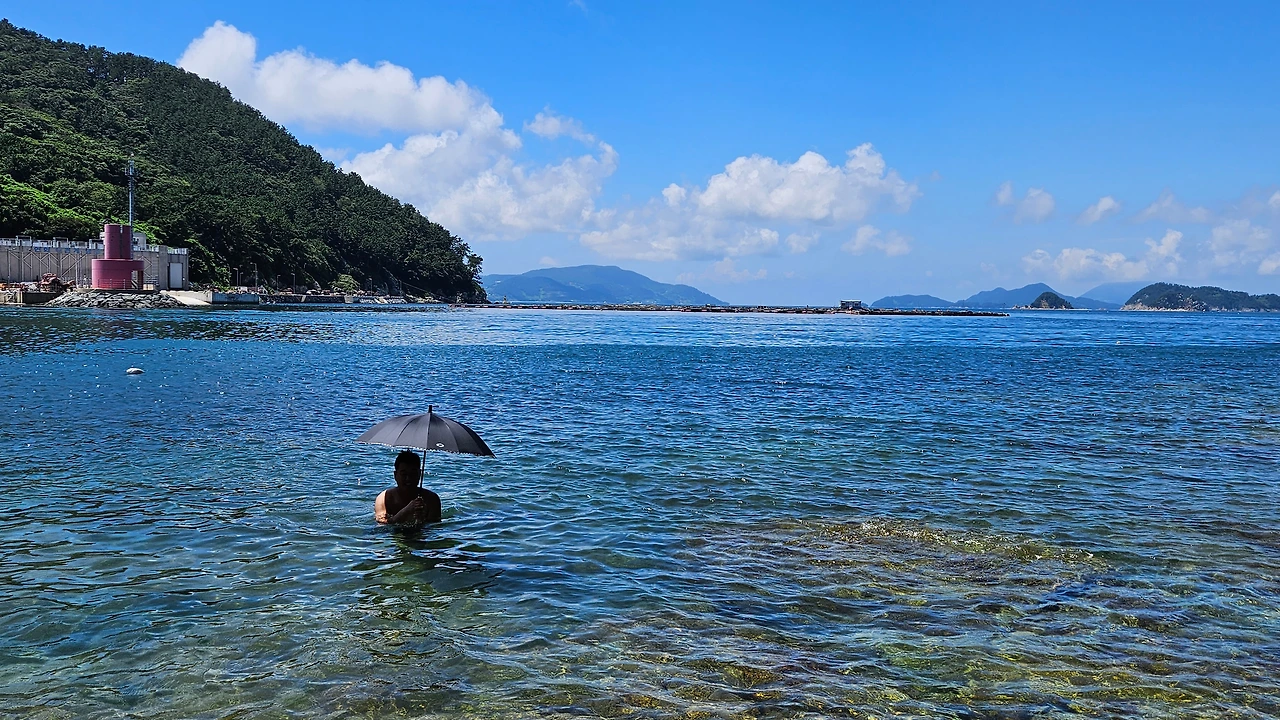 그렇게 누렸는데도 배시간이 아직 넉넉하게 남았다. 더위에 갈팡질팡하던 우리는 즐기기로 했다. 신랑은 옷을 입은 채 바다로 들어갔고 나는 데크아래 돗자리를 펴고 아이처럼 즐거워하는 신랑을 바라보며 대리만족을 즐겼다. 시원하다며 진즉에 안 들어온 걸 후회했다.