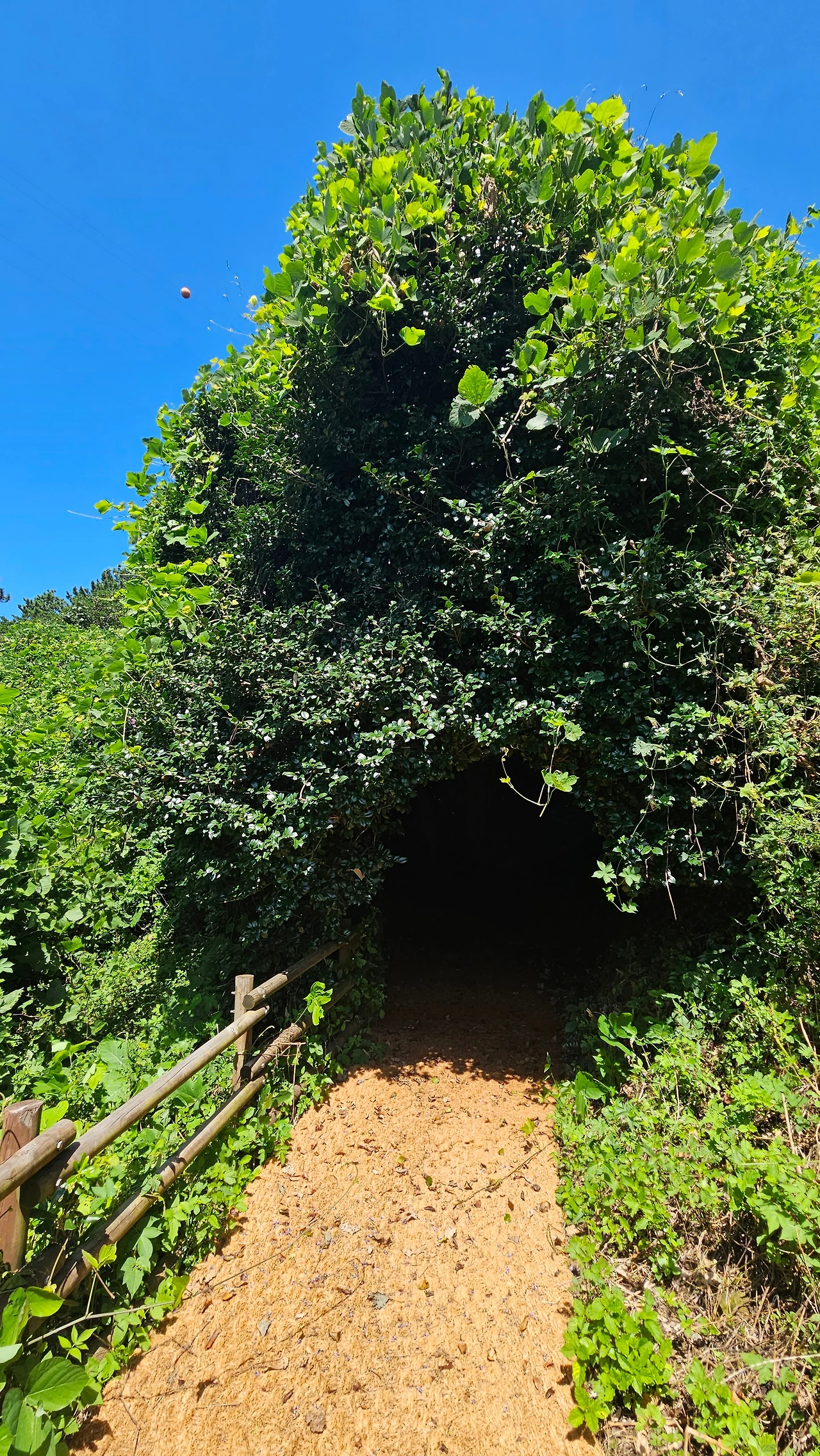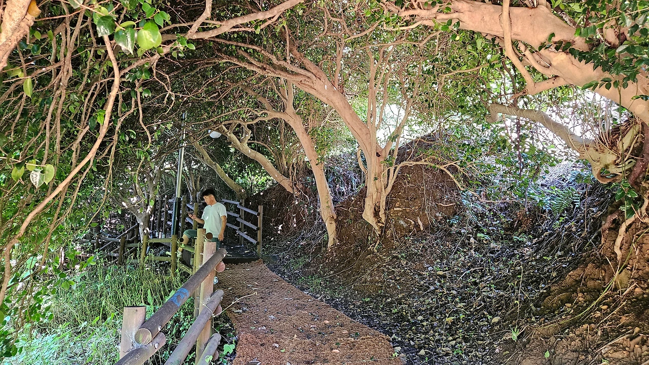 신랑이 앞서갔는데 급하게 나를 불렀다. 혹시나 다리를 삐끗했나 싶어서 부리나케 달려갔더니 동굴 같은 게 보인다. 나무동굴 안으로 들어갔더니 동화 속 숲 속에 들어간듯한 묘한 감정이 들었다. 신랑이 동백나무 같다는데 어찌 이렇게 늘어뜨려지냐고 나는 반박했다. 어쨌거나 동굴에서 또 다른 묘미를 만끽한 우리는 계속 걸었다. 걷기 좋은 둘레길이었다. 신랑은 본인다리가 아픈 게 야속한듯했다.