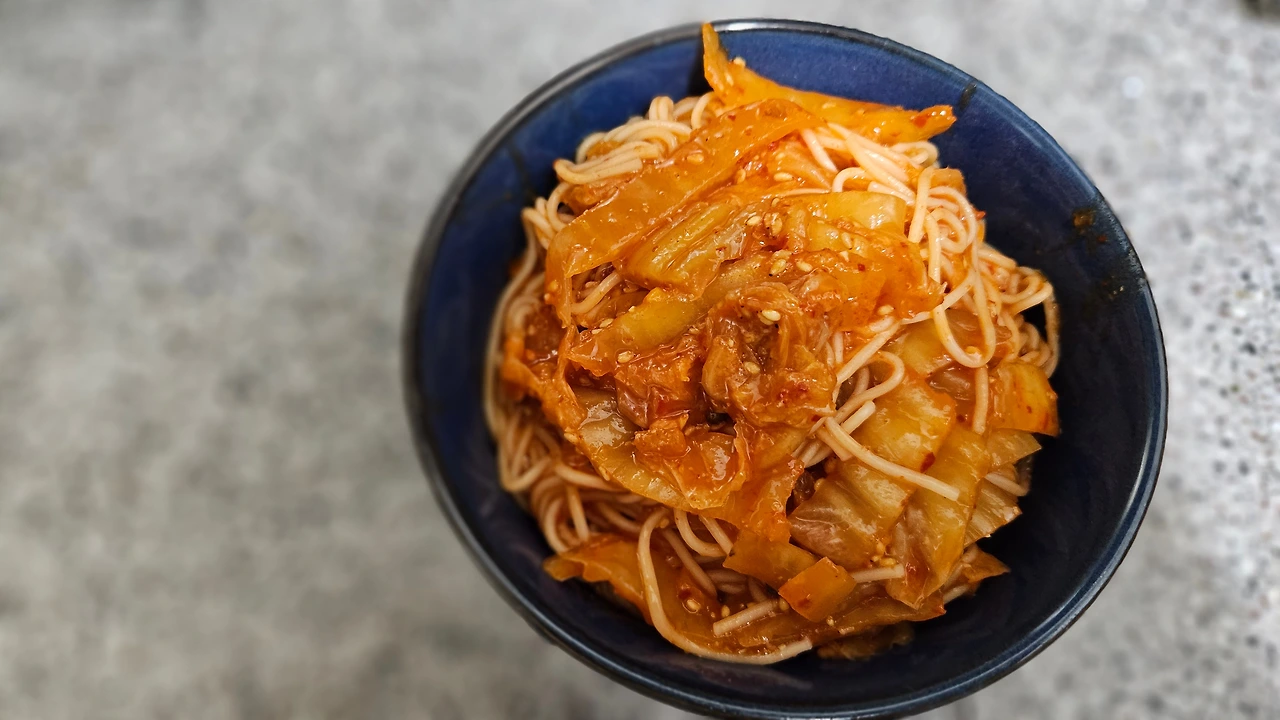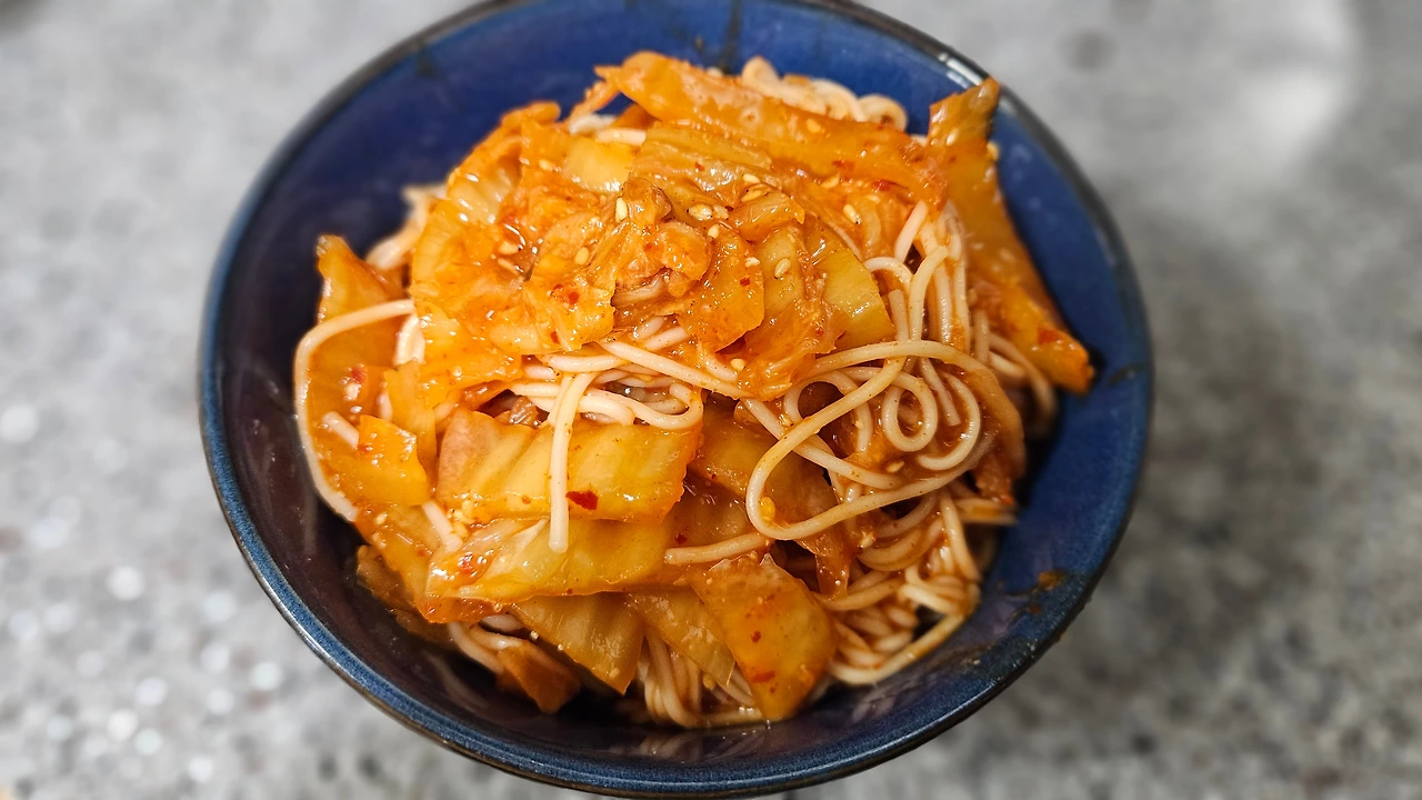 김치를 자잘하게 썰고 국수를 삶는다. 삶은 국수에 김치와 깨, 참기름을 붓고 올리고당으로 간을 하면 된다. 조금은 단 게 들어가야 입에 짝짝 붙는다. 감칠맛이 라고 해야 하나.