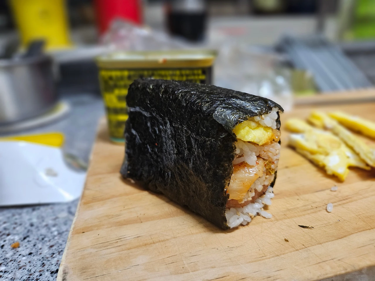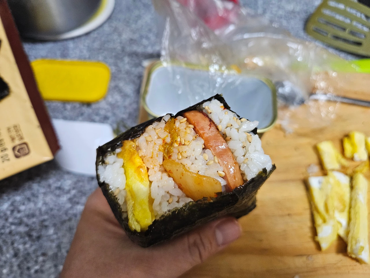 먹으면서 감탄한 나머지 만드는 방법을 여쭈었고 결국엔 레시피를 받아왔다. 사각 햄 한통, 볶음김치, 계란, 김밥 김만 있으면 되는 아주 간단한 음식이었다. 사각햄을 0.5cm 두께로 썰어서 노릇노릇 해질 때까지 구웠다. 계란도 계란말이처럼 구워 사각햄사이즈에 맞게 잘랐다. 김치까지 볶아서 준비를 마쳤다. 이제 만들기만 하면 됐다.