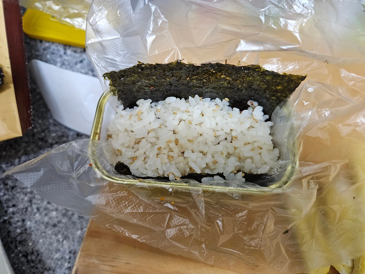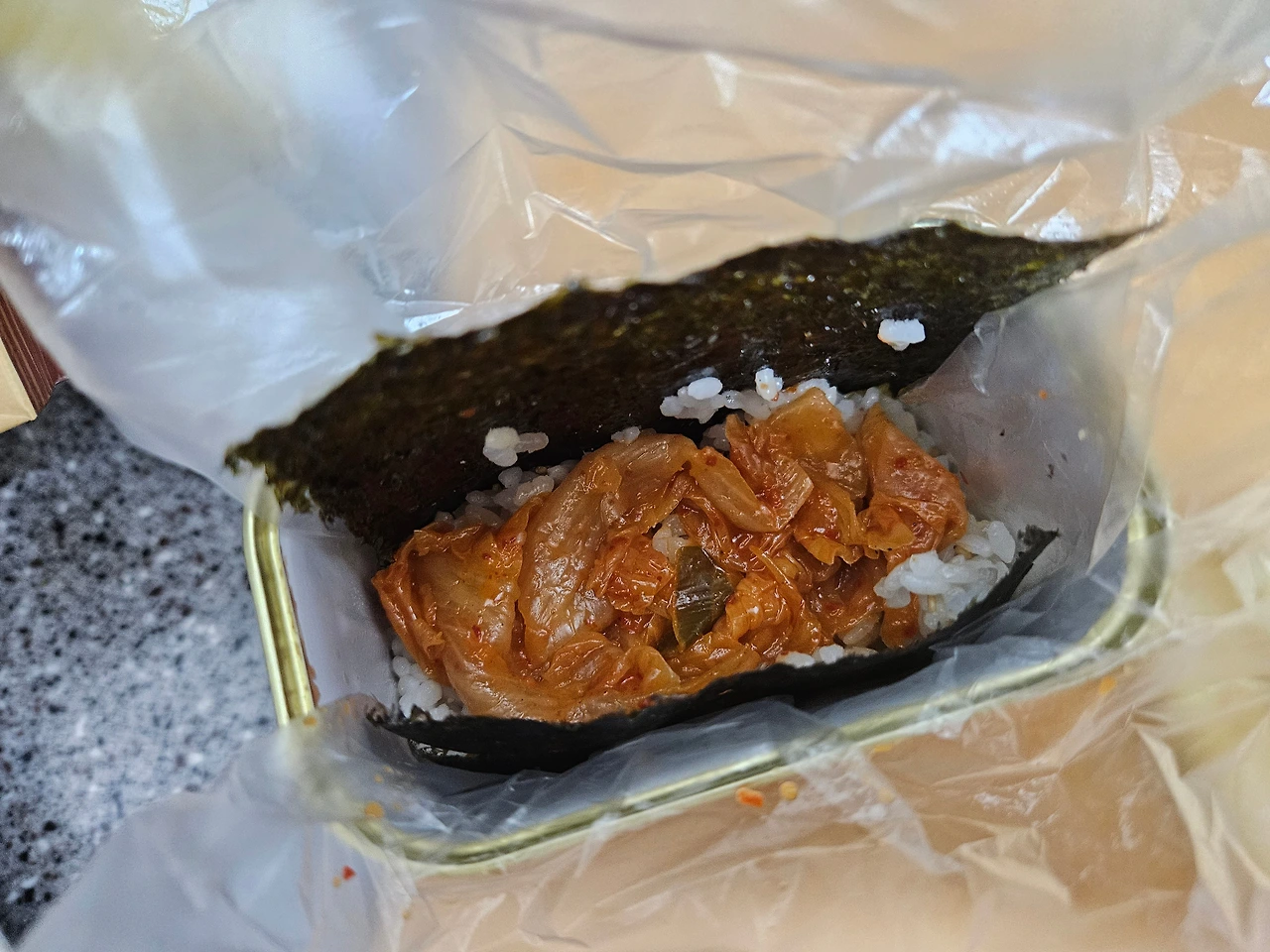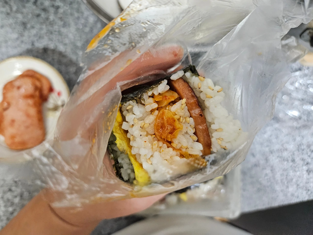 비닐팩 가장 큰 것을 4등분 내고 김밥김을 길게 2등분 냈다. 사각햄통을 가져다 앞에 두고 비닐팩을 깔고 김밥김을 넣었다. 밥 한 숟갈을 볼록하게 떠서 넣고 사각햄을 넣는다. 다시 밥 한 숟갈 볼록하게 떠서 넣고 이번엔 볶음김치를. 다시 밥 한 숟갈 볼록하게 떠서 넣고 계란을 올리고 밥으로 덮는다. 마지막 의식은 김이 길게 남은 쪽을 덮고 비닐까지 덮어 꾹꾹 누른다. 꾹 눌러졌다 싶으면 비닐을 당겨 김밥을 꺼낸다.