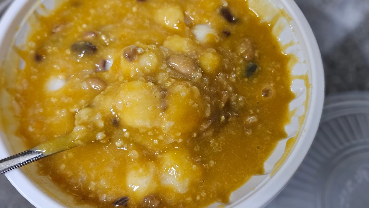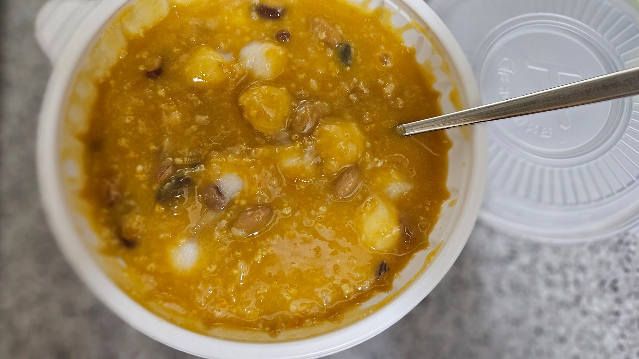 "똑똑, 호박죽 좋아한대가 내가 맨들어왔다. 땅콩도 넣고 콩도 넣고 수제비도 넣었다. 맛있을끼다. 먹어봐."
