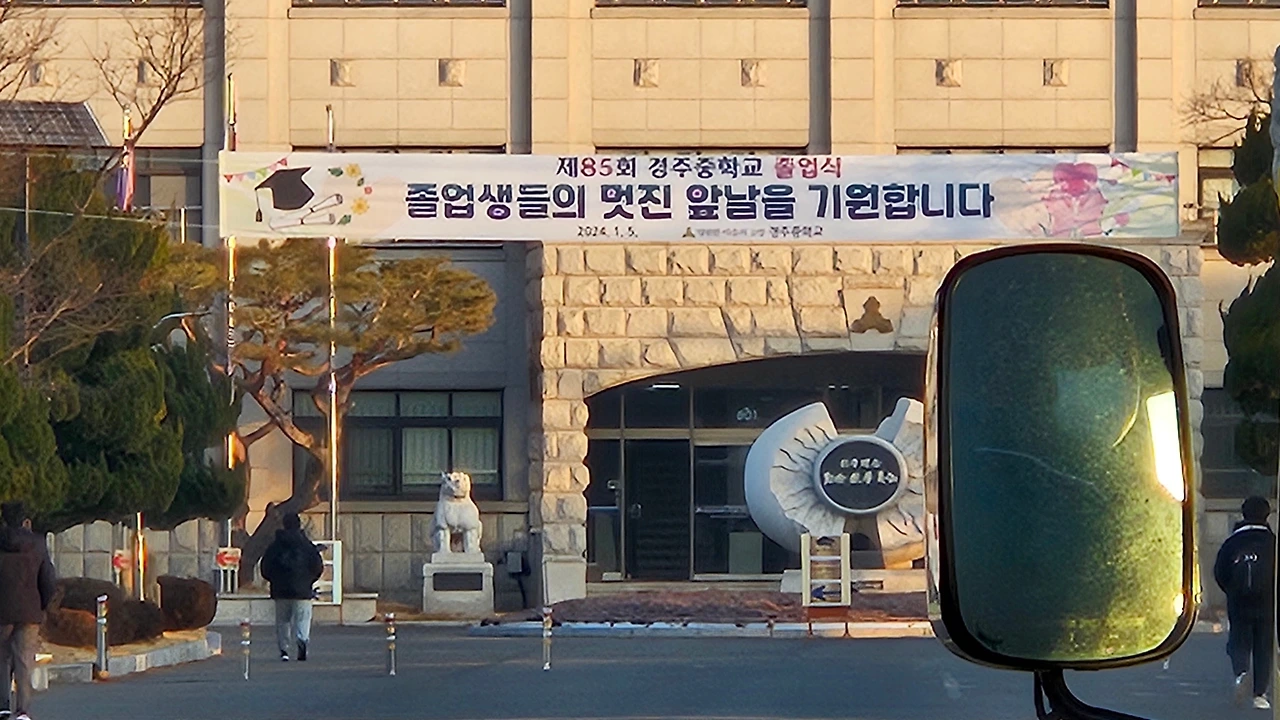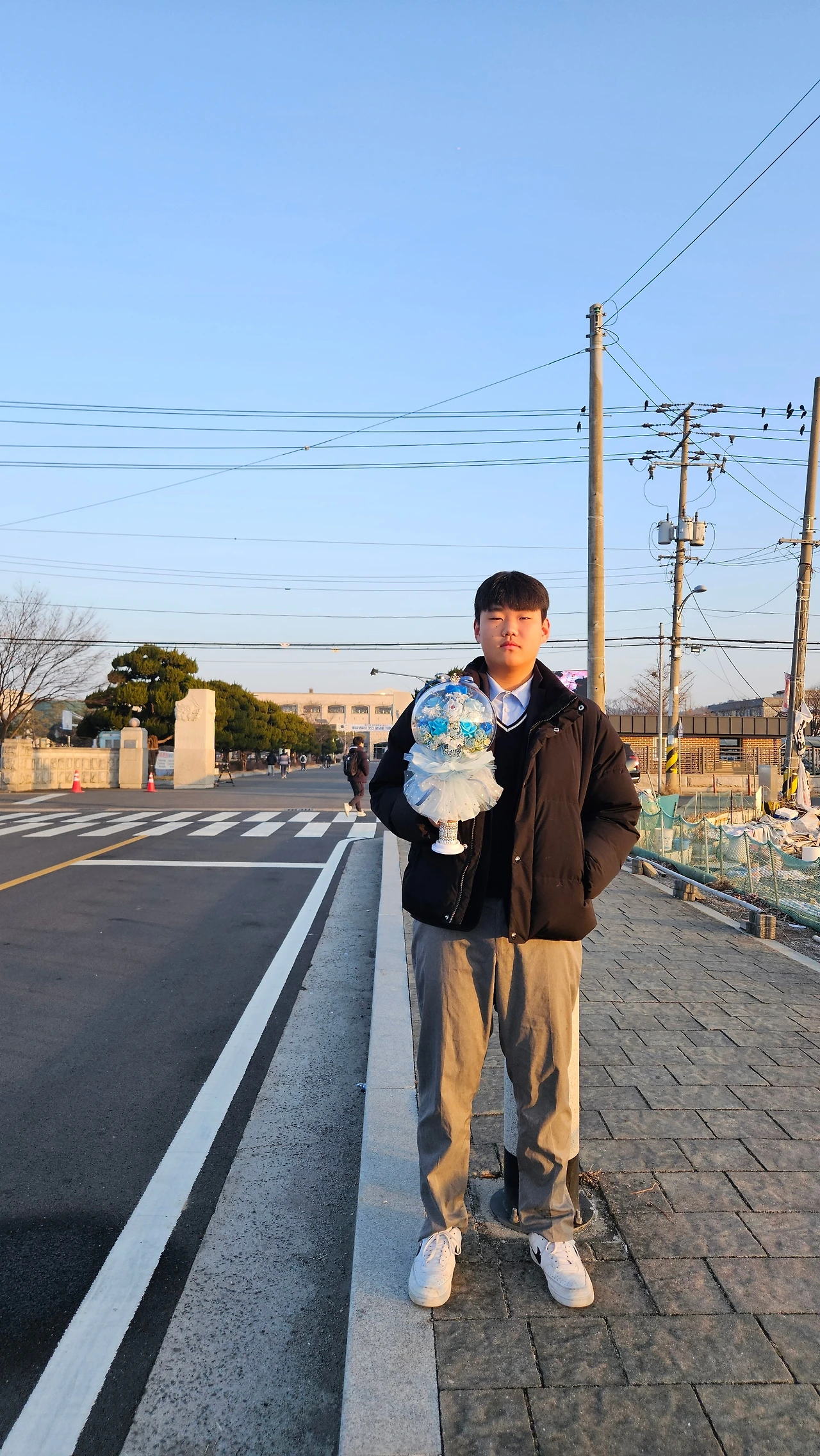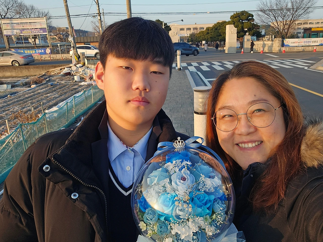 학교정문에 현수막이 붙어있을 거란 생각을 했고 사진이라도 남기자 싶어 주문해 두었던 꽃다발을 꺼내와 아이에게 안겨주었고 정문에서 사진이라도 남기자했더니 흔쾌히 그러자고 한다. 아이는 괜찮다 했지만 말투에도, 표정에도 아쉬워하는 마음이 역력히 묻어난다. 학교 앞에 도착하니 현수막이 학교 안에 걸려있다. 아놔, 예상이 빗나갔다. 그럼에도 사진을 남겨야 된다며 열심히 찍어댔다.
