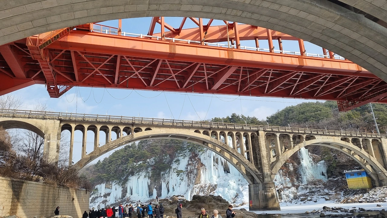 철원 9경 중 하나인 송대소는 태봉대교에 도착하기 전 마지막 관람지이다. 알록달록 물감을 짜놓은 듯한 지층색깔 때문에 주상절리 팔레트라고도 불린다 했다. 입을 다물 수 없는 절경에 턱이 빠질 지경이었다.