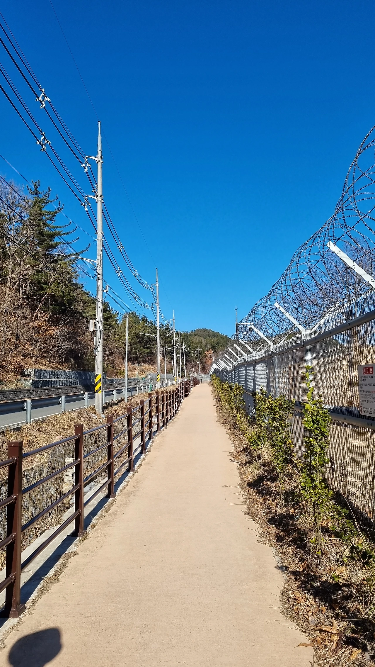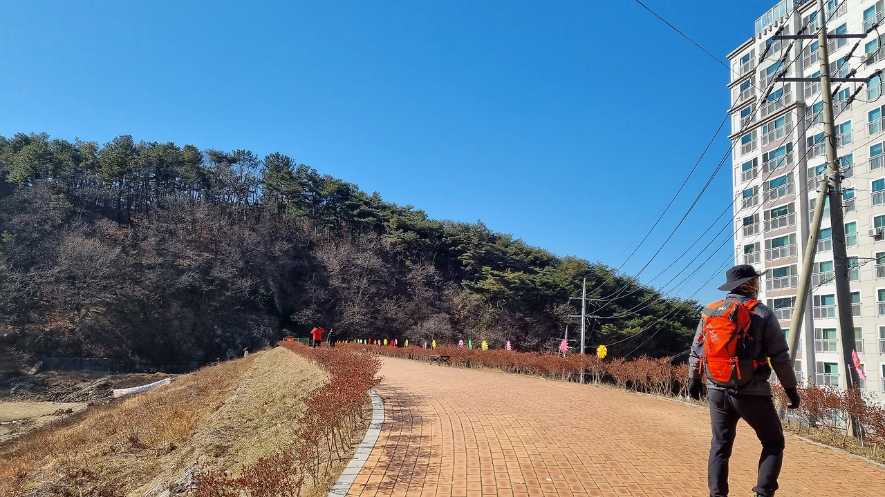 경주시 동천동에서 용강동으로 넘어가는 뒷길이었다. 도로옆으로 자전거도로처럼 여유 있는 길이 있어서 나란히 걷기에도 충분했다. 산과 산사이에 난 도로를 따라 걷다 보니 아파트가 보인다. 이제는 산을 올라야 한다는 걸 직감적으로 알 수 있었다.