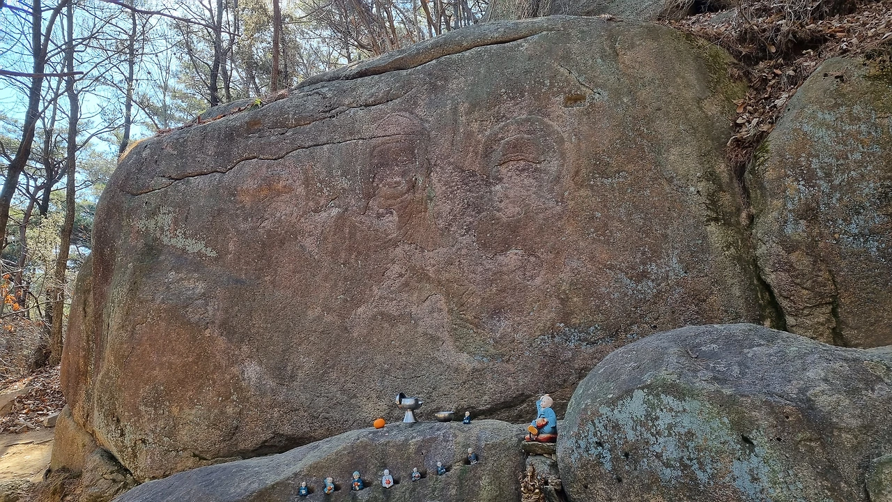 산 능선에는 경치를 보며 할 수 있는 운동기구도 있었고, 조금 더 내려오니 삼존마애불좌상도 있었다. 경주에 있는 산마다 이런 불상들이 있는 것을 보면 지붕 없는 박물관이란 말이 틀리지 않다는 것을 실감할 수 있다. 경주에 살아서 기분 좋았던 순간이다.