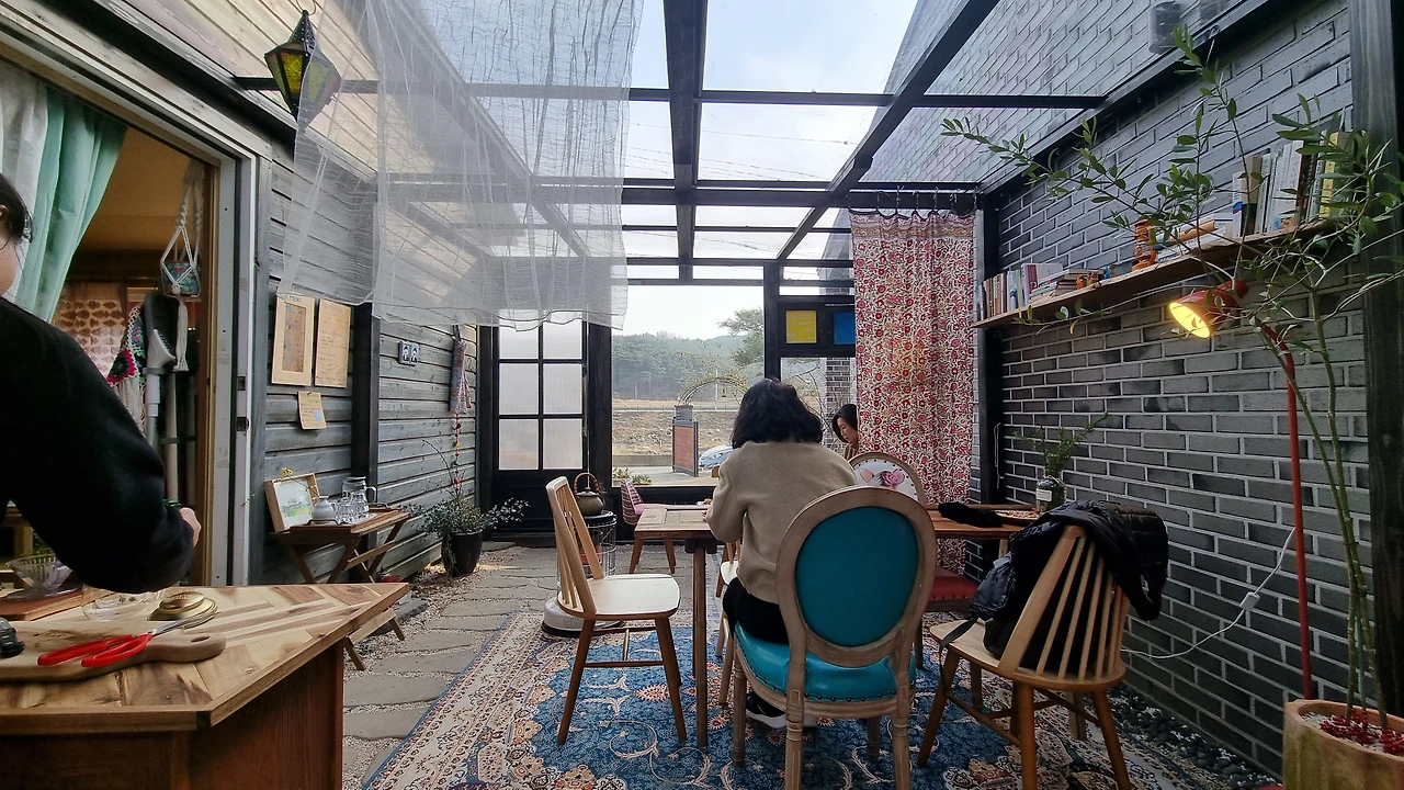 원래는 천막이 쳐져있었고, 원테이블로 되어 있어서 가게(인도소품샵)에 오시는 분들께 짜이나 커피를 무료로 대접해 주셨던 자리인데 명절을 보내고 갔더니 어엿한 커피숍의 자태를 하고 있었다. 사장언니와 너무나도 잘 어울리는 장소였고 두리번거리다 나도 이내 이곳 분위기에 젖어들었다. 버선발로 반겨주시는 사장언니와 짧은 인사를 뒤로 하고 만나기로 한 선생님과 인사를 나누었다.