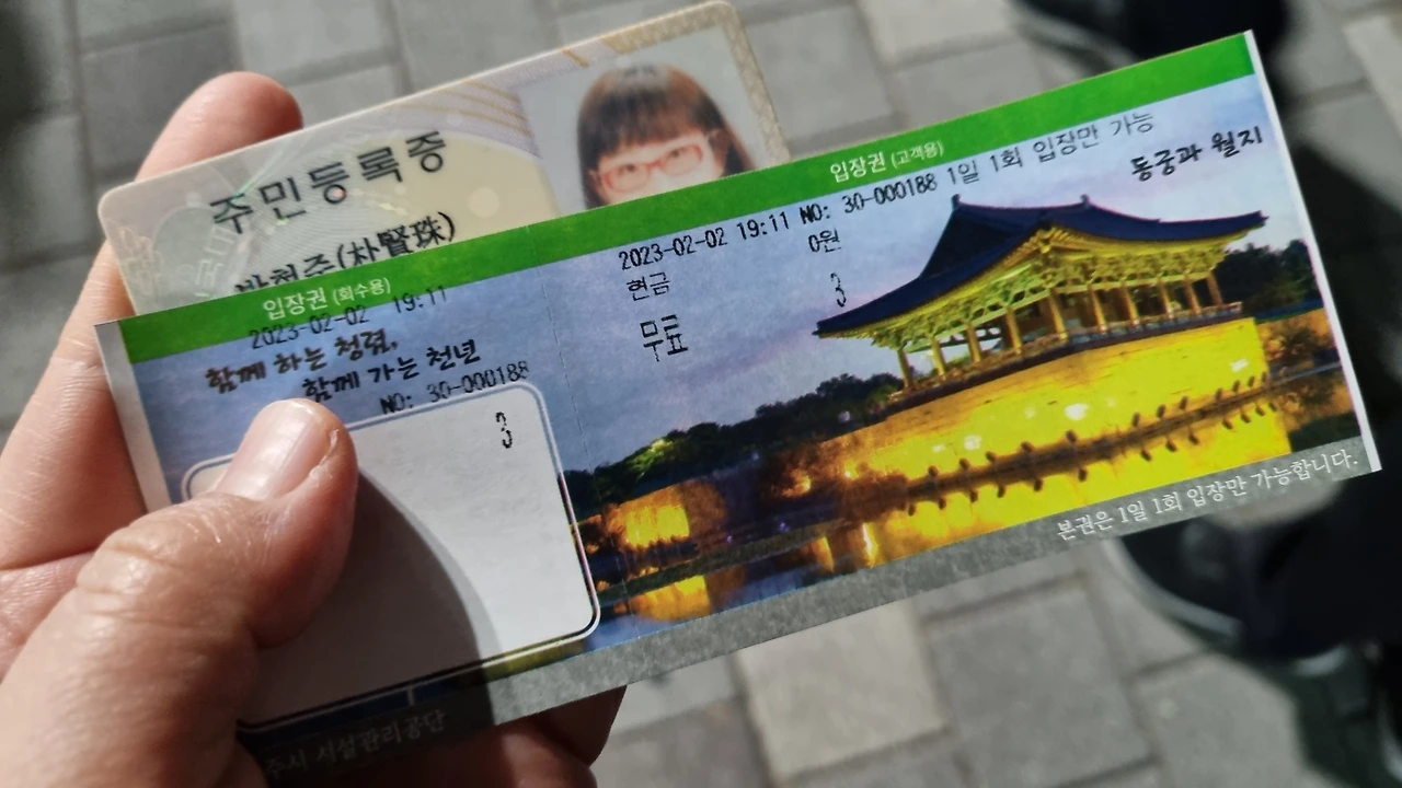 차로 15분여를 달려 우린 '동궁과 월지'에 도착했다. 겨울은 이미 지나간듯한 분위기, 주차장부터 빼곡하다. 경주시민이라는 특권으로 신분증제시 후 무료입장권을 받아 입장했다.