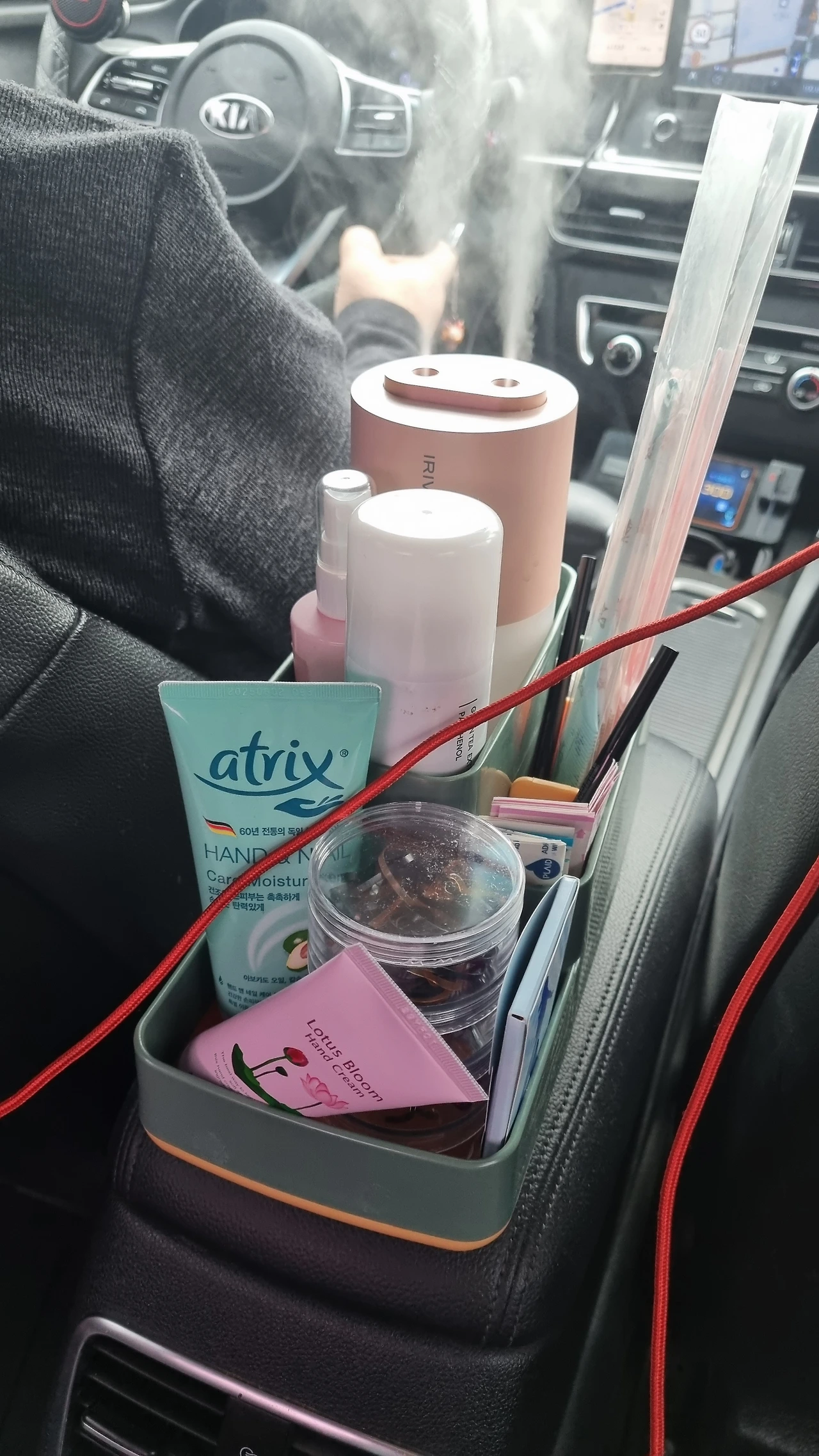차 안에는 화장대가 옮겨져 있는 듯했다. 불 들어오는 거울, 화장퍼프, 면봉, 실삔, 고무줄, 집게 핀, 반창고, 미스트, 핸드크림, 가습기, 고데기까지 없는 게 없었다. 내화장대보다 훨씬 다양하고 거창했다. 가는 내내 대박을 외치며 이것저것 살피기에 바빴다.