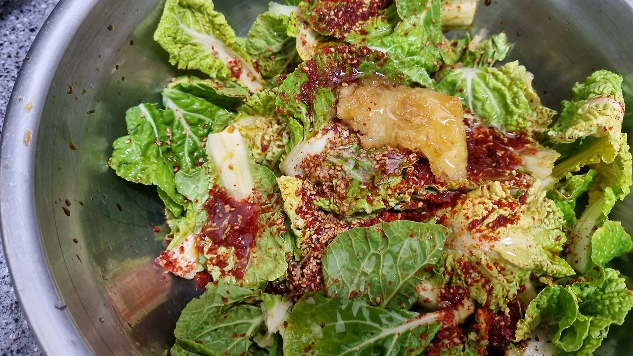 제일 먼저 먹기 좋게 뜯는다. 봄동요리할 때만큼은 보통 칼을 사용하지 않는다. 손맛이 거기까지 영향을 끼칠지는 모르겠지만 조금이라도 손맛을 더하기 위해 한입에 먹기 좋게 손으로 뜯는다. 뜯은 후 여러 번 세척한다. 물기가 어느 정도 빠지면 고춧가루, 간장, 식초, 올리고당, 다진 마늘, 통깨만 넣고 조물조물해 주면 끝이다. 참! 요리의 마지막에 두르는 고소함 가득한 참기름은 화룡점정이 된다.