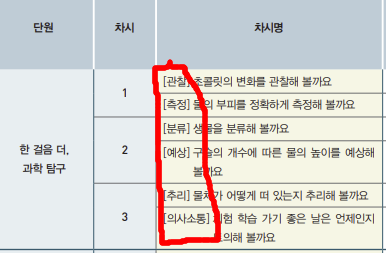우리나라 과학교과서에는 탐구기능을 기초와 통합의 두 가지로 구분하여 제시한다. 이 두 가지 탐구기능은 다른 교과에서도 적용할 수 있는 기능이므로 과학시간에 정확하게 배워두면 유용하다. 기초탐구기능은 3~4학년 과학교과서의 처음 단원에서 집중하여 다루는데, 그 여섯 가지 요소는 다음과 같다.
