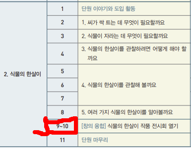 왼쪽 표는 같은 학년의 둘째 단원이다. 여기도 마찬가지로 9~10차시에 '식물의 한살이 작품 전시회 열기'를 한다. 이 차시를 먼저 소개한 다음에 1차시부터 수업을 하면 학생들이 자신이 전시할 식물을 선정하고 싹을 틔우고 관찰한다. 이런 과정을 통하여 과학적 탐구역량을 더욱 잘 갖춘 상태에서 전시회를 하게 된다.