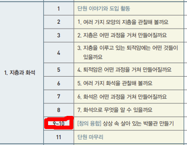 왼쪽의 표는 초등학교 4학년 1학기 과학교과서의 첫번째 단원 순서이다. 중간의 숫자 1부터 11까지는 '차시'라고 하여 수업 순서를 의미한다. 과학시간이 일주일에 두 번이면 이번주에는 1과 2차시 수업을 한다. 9~10차시에는 창의융합 영역으로 '상상 속 살아 있는 박물관 만들기' 수업이다. 만약에 담임교사가 교과서의 순서대로 1차시부터 가르치면 학생들이 '박물관을 만들' 준비를 충분히 갖추지 못할 수 있다. 그러므로 이 단원을 시작할 때, 학생들에게 "창의 융합" 차시를 먼저 소개하는 게 바람직하다. 그러면 학생들이 "박물관 만들기'를 위하여 1차시부터 준비할 수 있다.