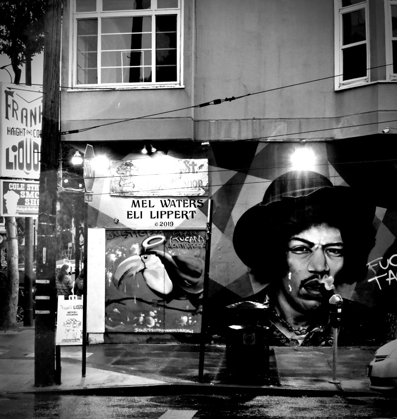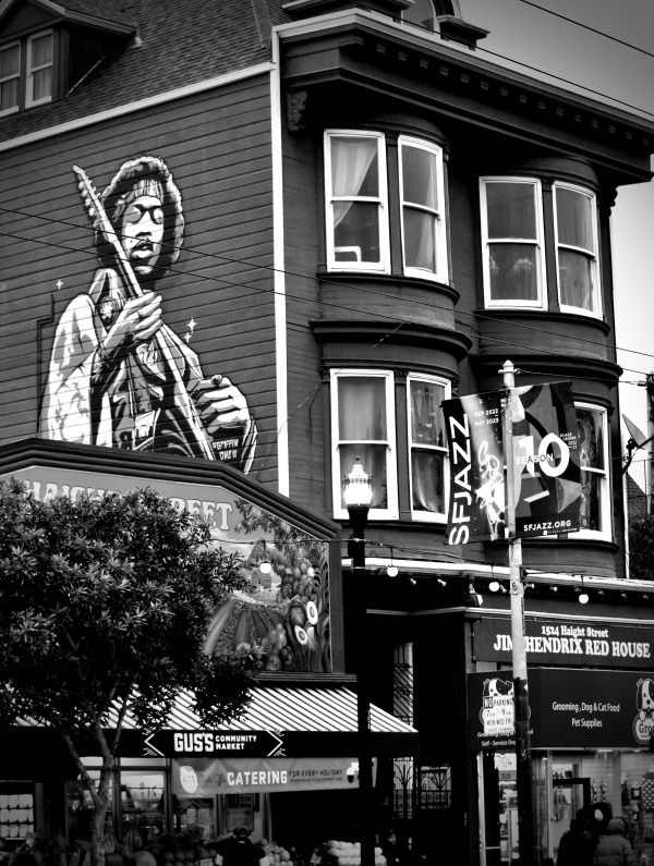 버스가 도착하고 헤이트 애쉬버리(Haight Ashbury st.) 거리 입구에 들어서자마자 처음 마주한 '지미 핸드릭스의 집'은 그 당시 자유를 상징하던 '히피 거리'를 안내하는 관문이었습니다. 1969년, 시골 음악 축제로 출발했던 '우드스탁(woodstock)' 축제가 주었던 파급력과 혁명은 후대에 아직도 자주 회자되고 있습니다. 그중에 명장면을 꼽자면 단연, 지미 핸드릭스의 공연 인트로였습니다. 이펙터가 잔뜩 낀 기타 소리로 미국 국가의 연주를 통해서 당시 베트남전에 대한 반전 의식을 음악적으로 표현했습니다. 그는 기타로 비행기의 소리, 전쟁의 포격 소리를 통해 기존의 권위주의, 패권주의에 물든 기존 미국의 정치권력에게 반기를 들었습니다. 지금 보아도 손색없는 그의 공연은 기타를 연주하는 연주자뿐 아니라, 히피 정신을 나타내는 상징과 같은 연주였습니다.